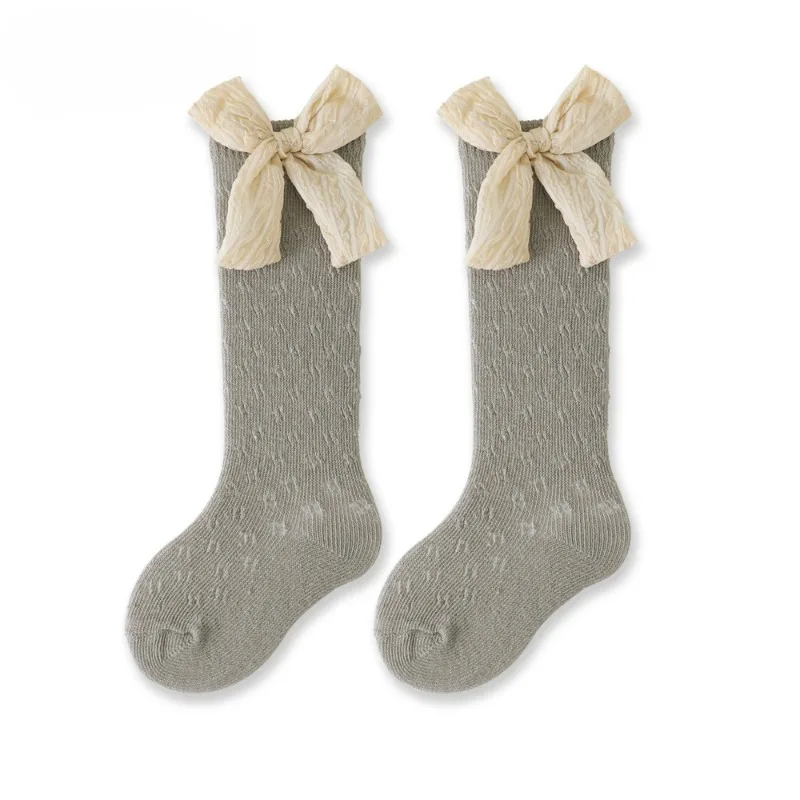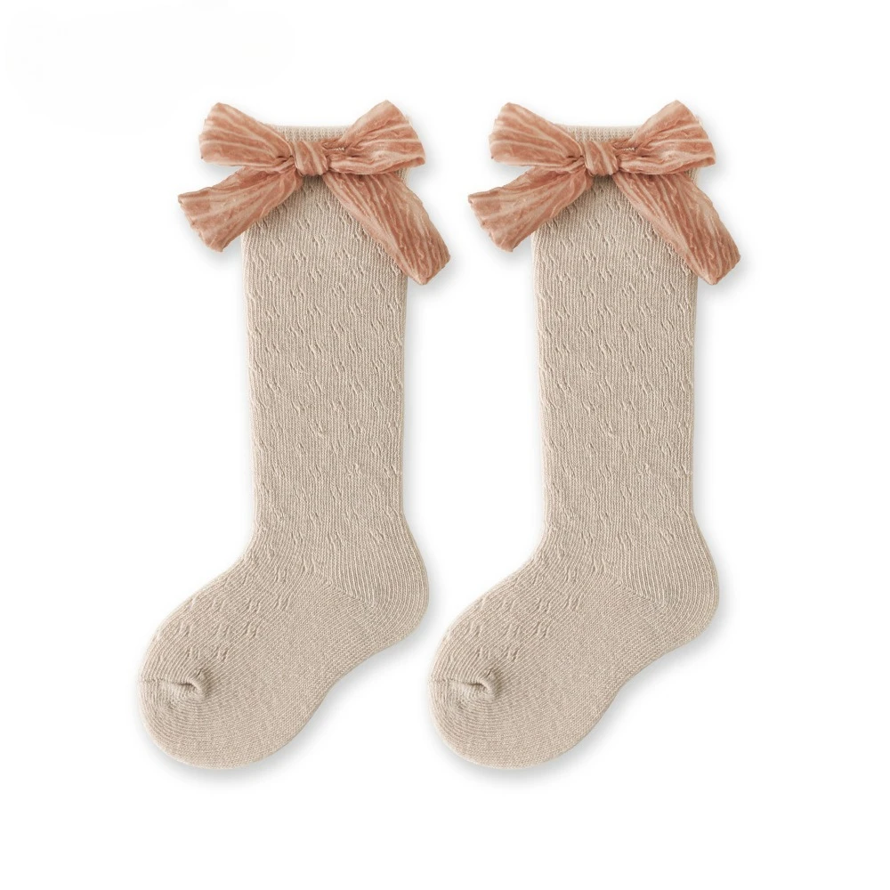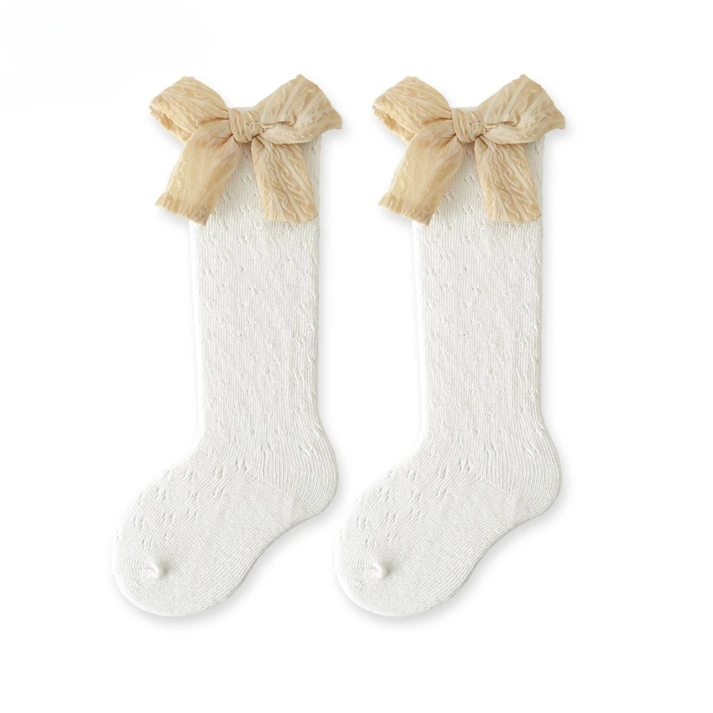 2025 Calcetines de algodón de clase A de verano para niña, calcetines por encima de la rodilla de malla de princesa con lazo fino, medias transpirables a media pantorrilla para niños pequeños