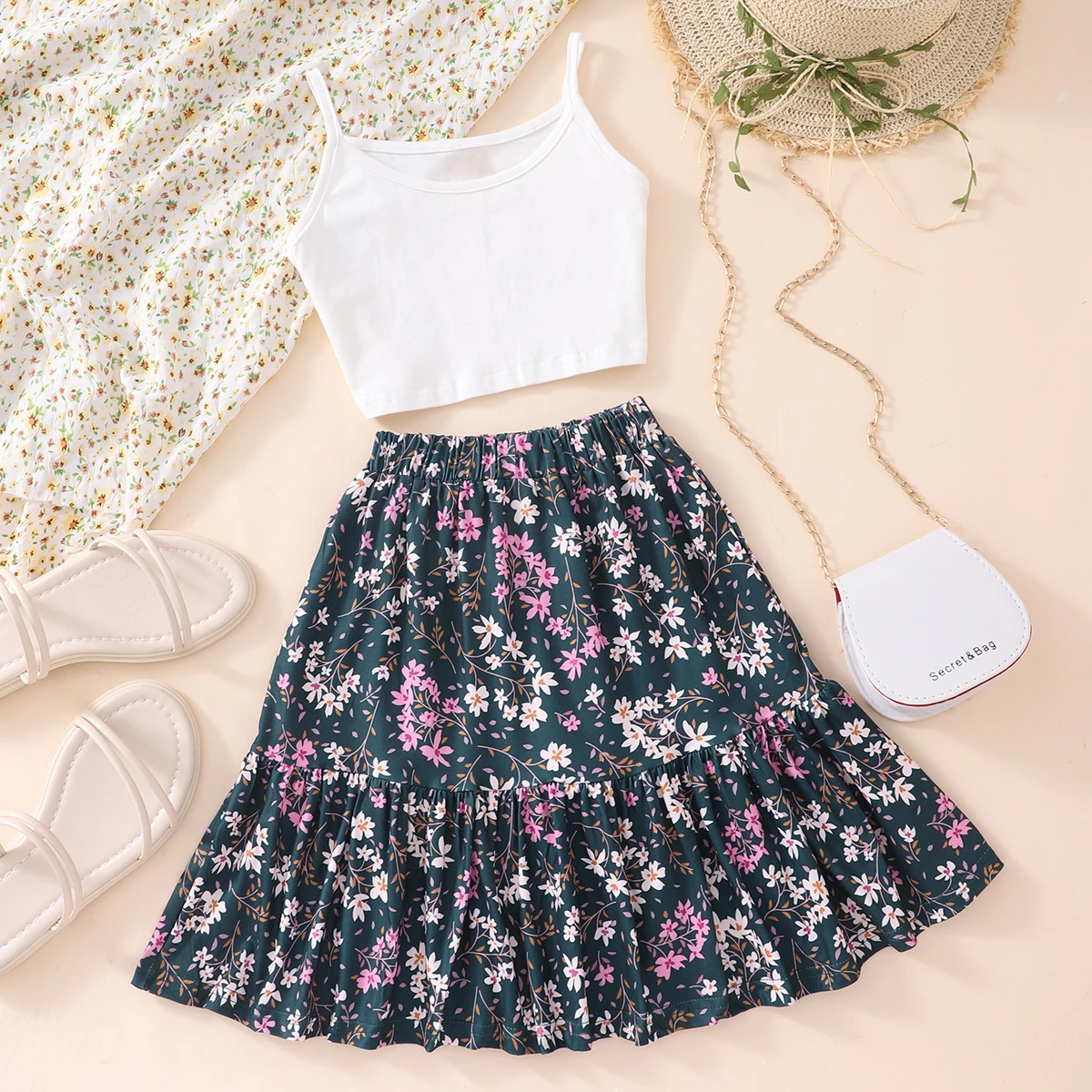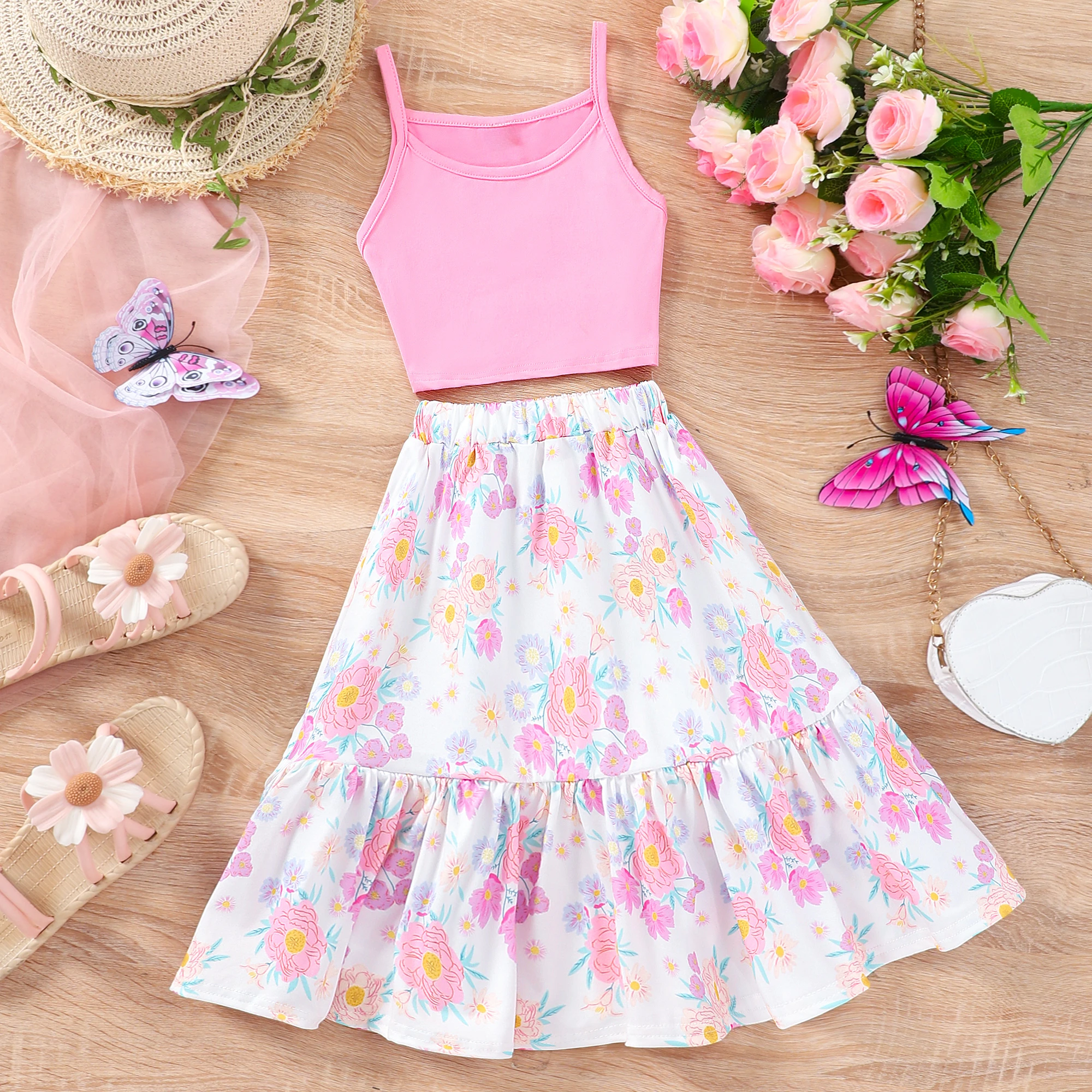 Comprar 2025 Chaleco rosa y falda floral Traje de niña para niños Verano Dulce Lindo Casual Fiesta de vacaciones Niños 2 piezas Conjunto 6 7 8 9 10 11 12 años