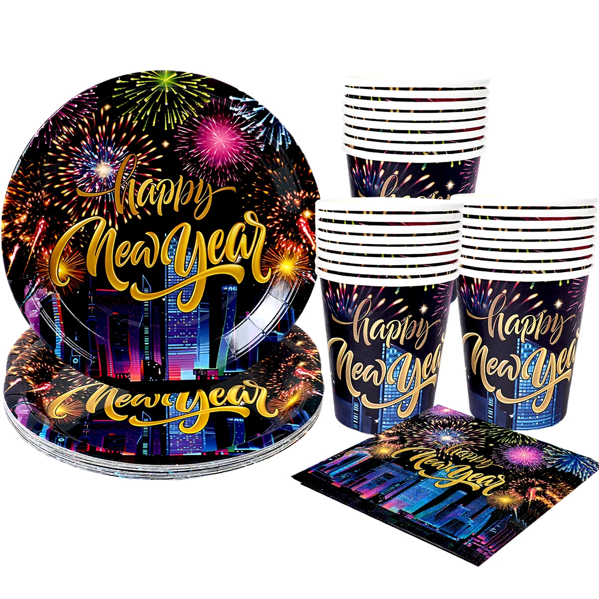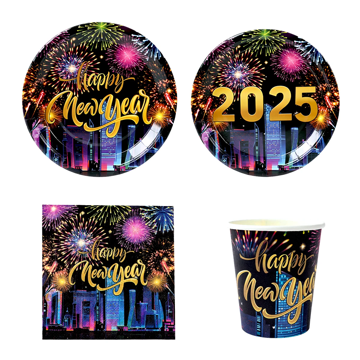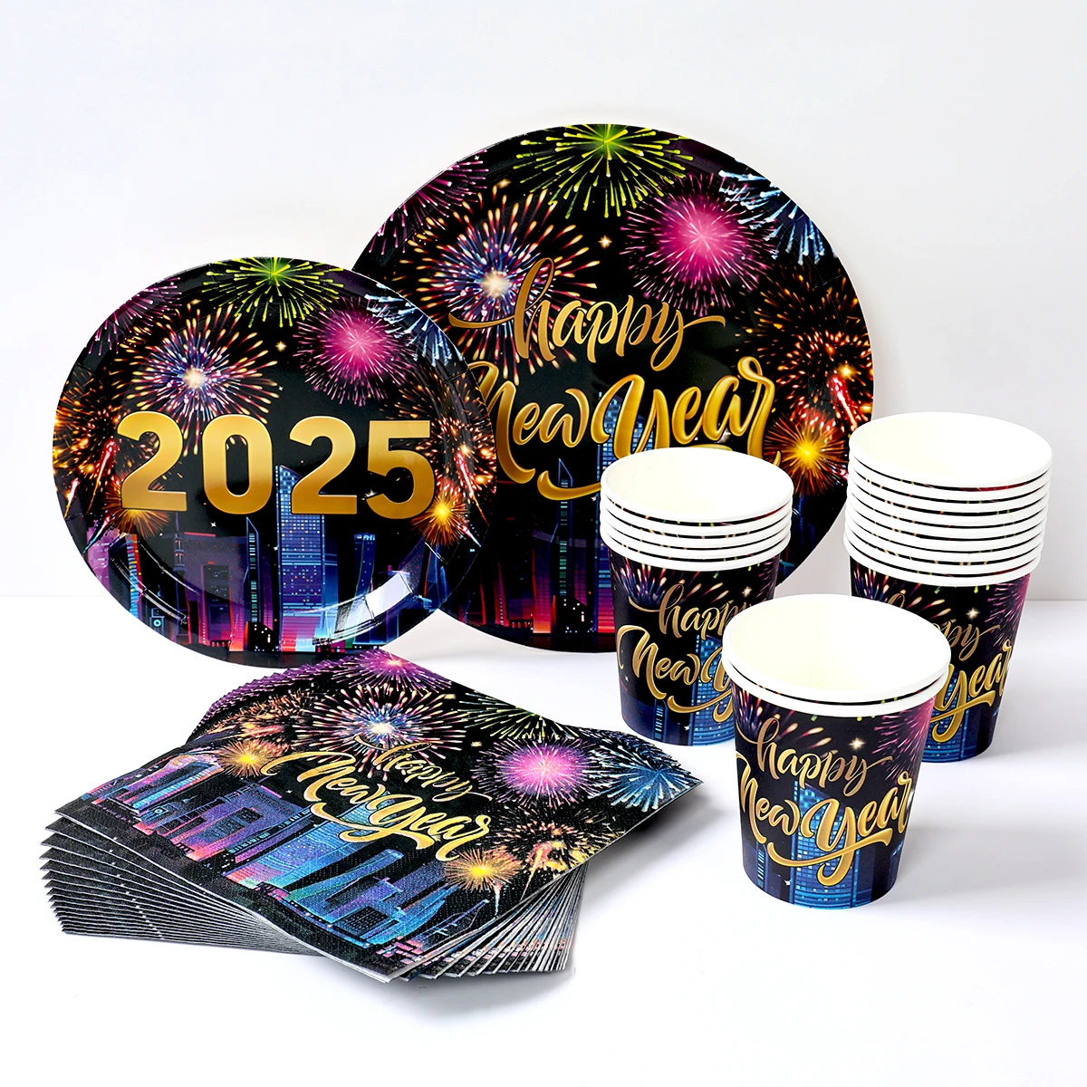 Comprar 2025, decoración de fiesta de Feliz Año Nuevo, platos, servilletas, tazas de fuegos artificiales, coloridos, artículos para 2024, fiesta de Feliz Año Nuevo