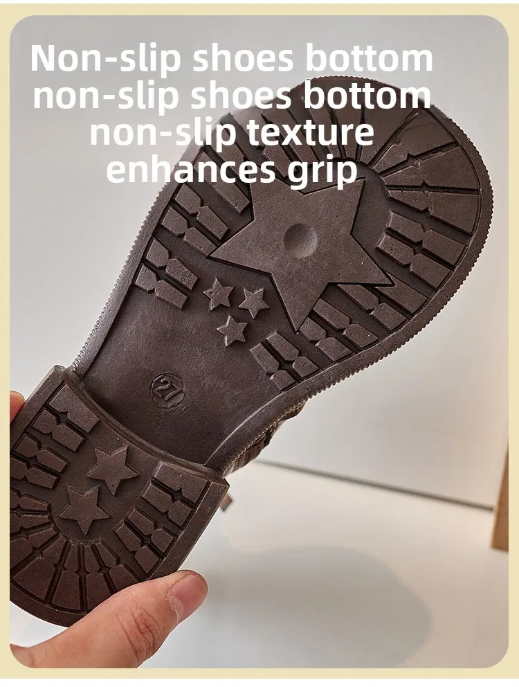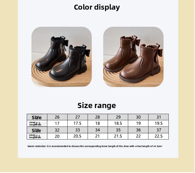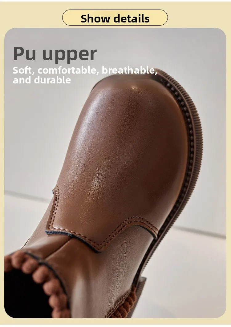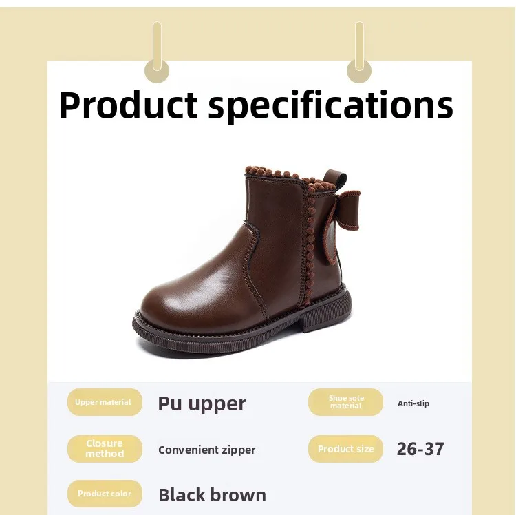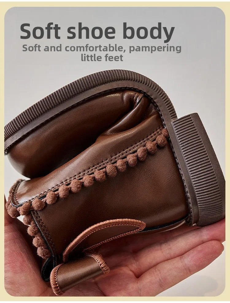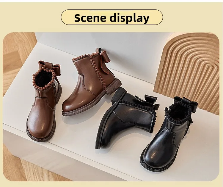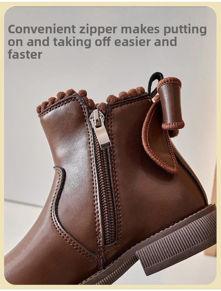 2025 lindos botines de cuero PU con pompón para niños, zapatos de invierno de terciopelo muy cálidos para niñas, zapatos de estudiante con nudo de mariposa a la moda de tacón bajo