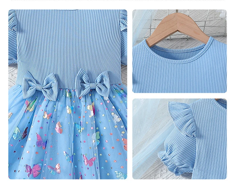 Diseño encantador: Este adorable vestido presenta una encantadora combinación de un corpiño a rayas y una falda de malla adornada con coloridos estampados de mariposas y puntos brillantes.Las lindas mangas con volantes y los elegantes lazos en la cintura añaden un toque de dulzura y encanto, haciéndolo perfecto para las princinhas.