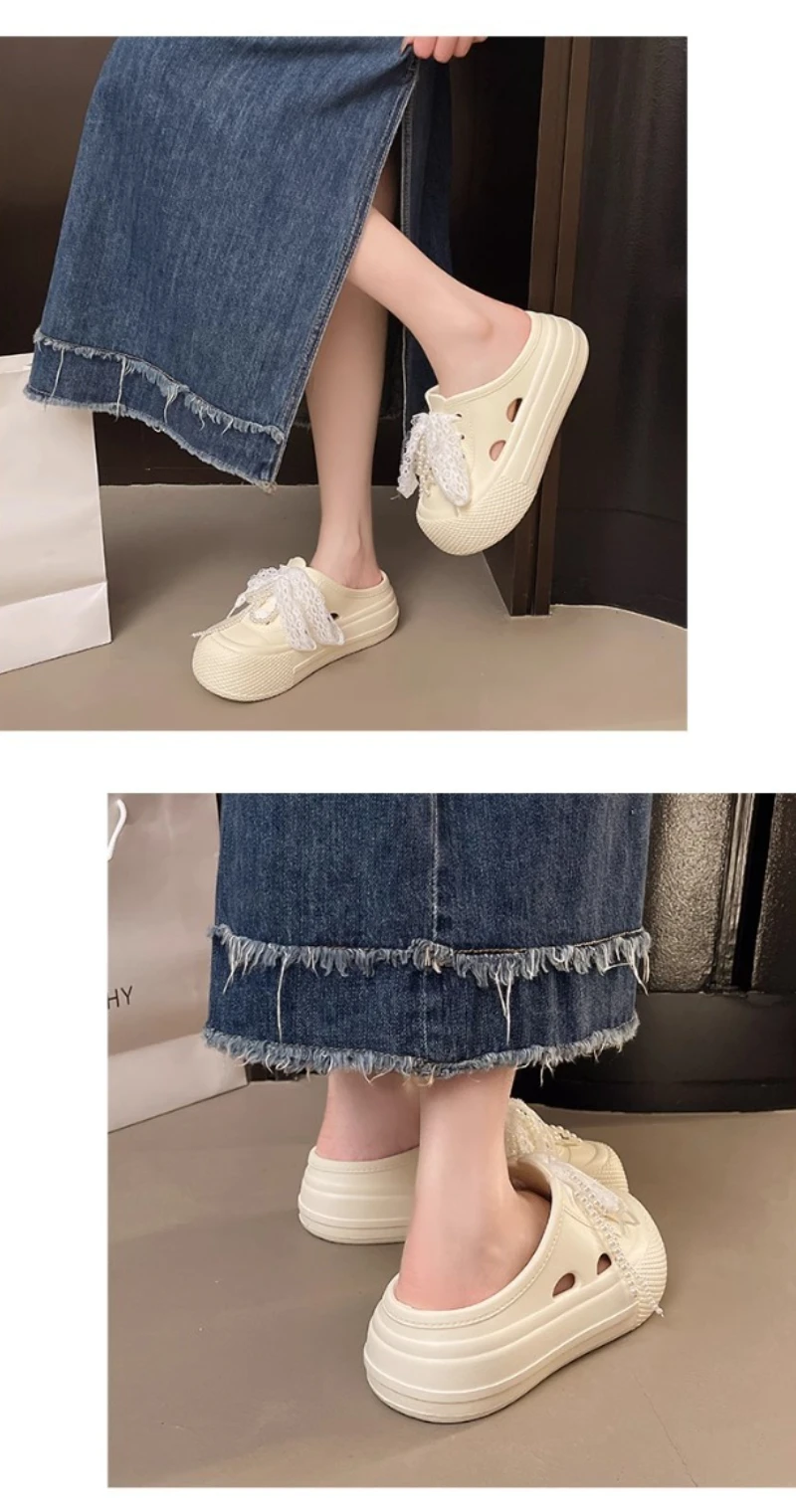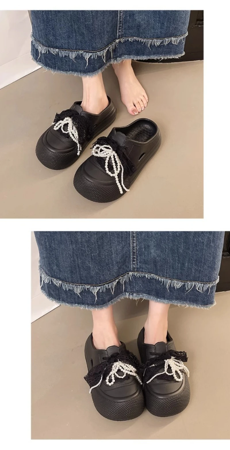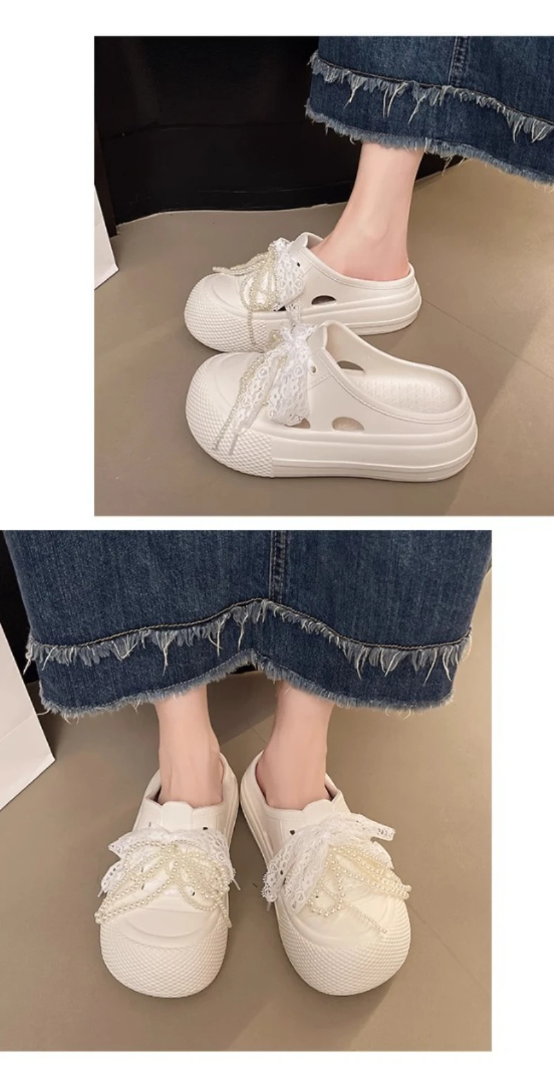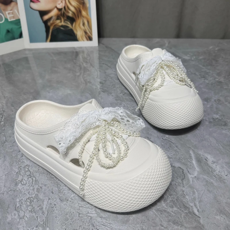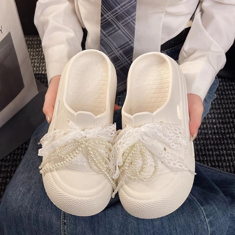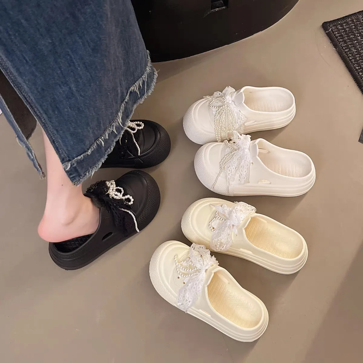 2025 nuevos zapatos de verano, zapatillas de plataforma para mujer, toboganes de playa para interiores, zuecos con lazo de perlas de encaje DIY, sandalias de moda para niñas