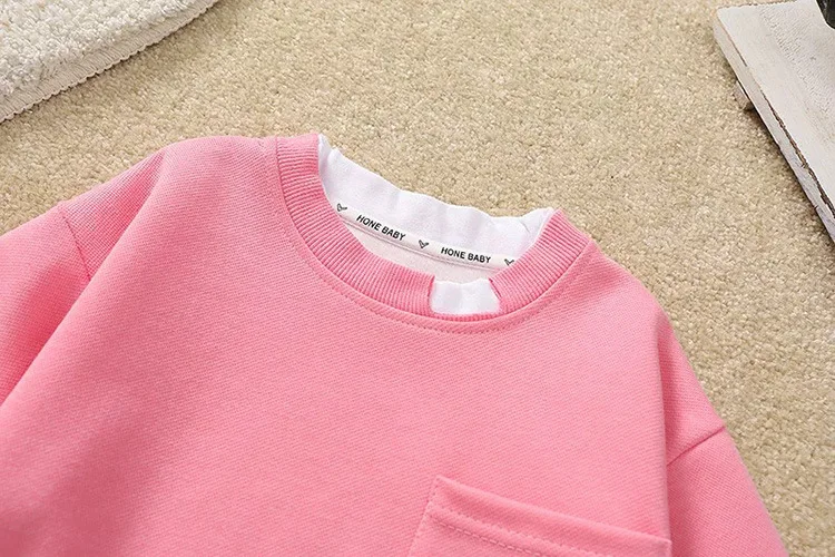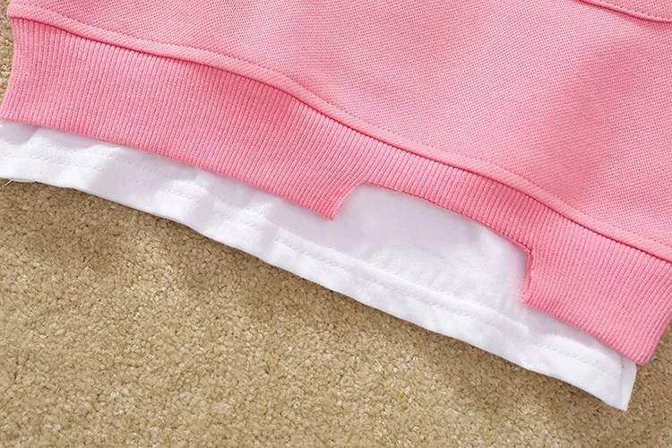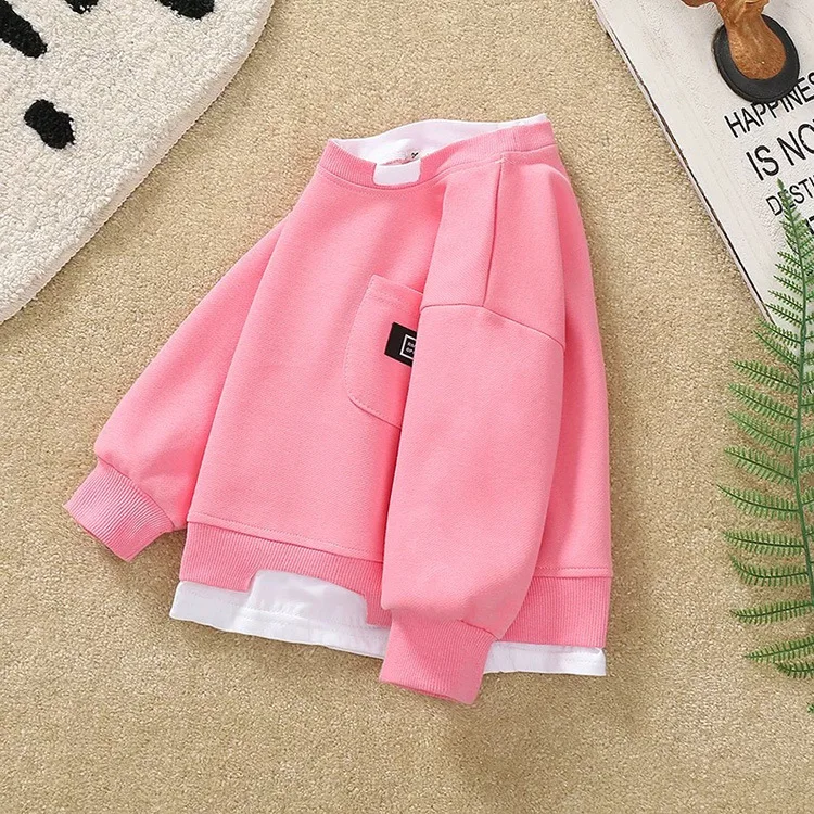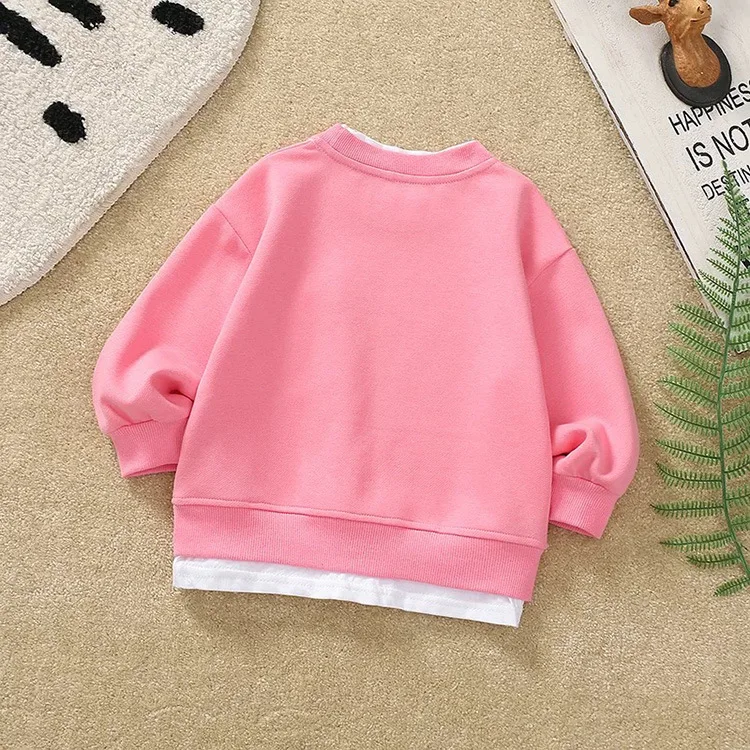 2025 Otoño Nueva sudadera falsa de dos piezas para niños coreanos: rosa de manga larga, bonita, agradable para la piel, versátil para uso diario y escolar