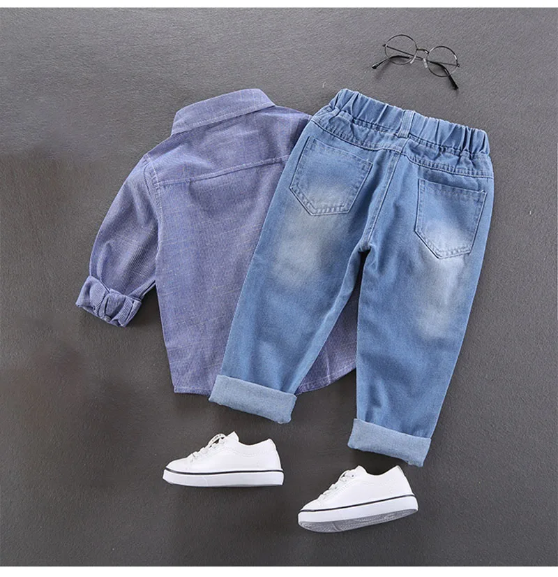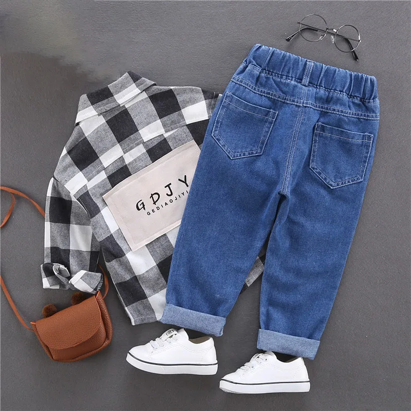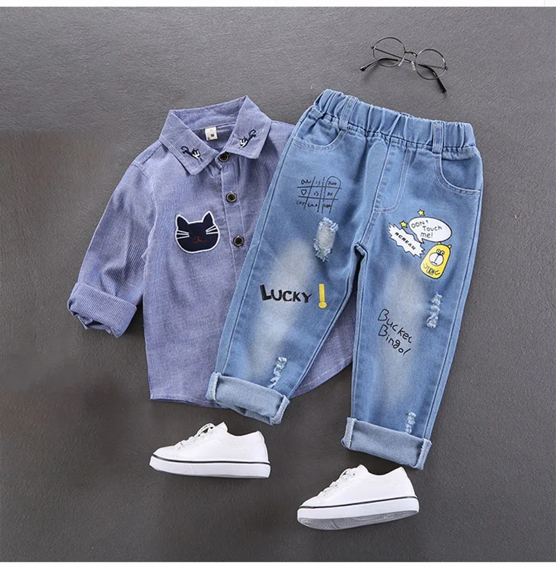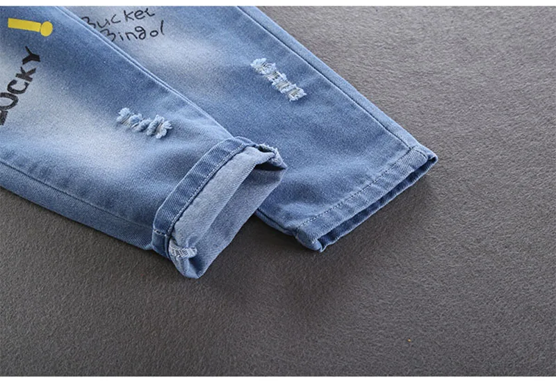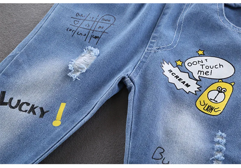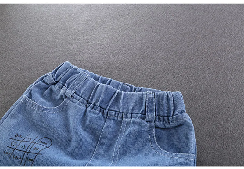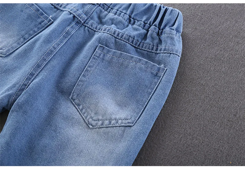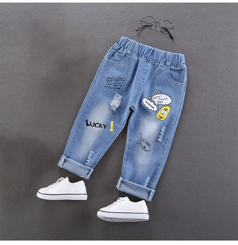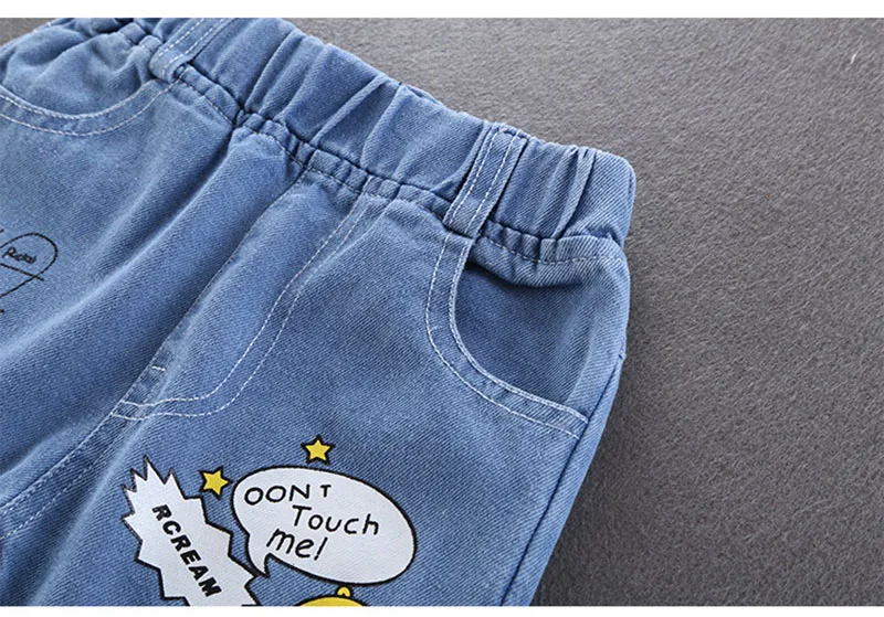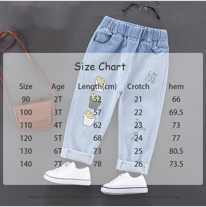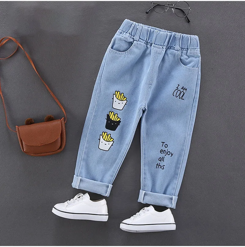 Comprar 2025 primavera nuevo Denim dibujos animados patatas fritas niños niñas Jeans cintura elástica Casual niños carta Denim pantalones azules