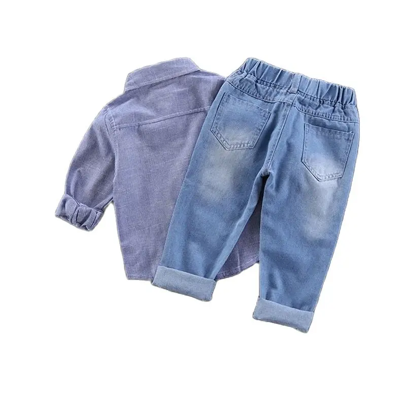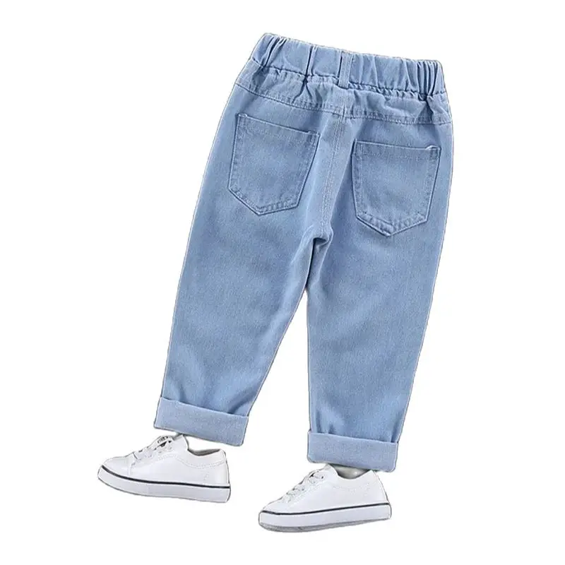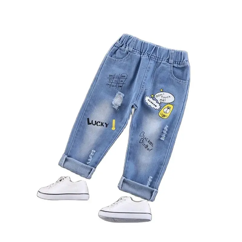 Comprar 2025 primavera nuevo Denim dibujos animados patatas fritas niños niñas Jeans cintura elástica Casual niños carta Denim pantalones azules