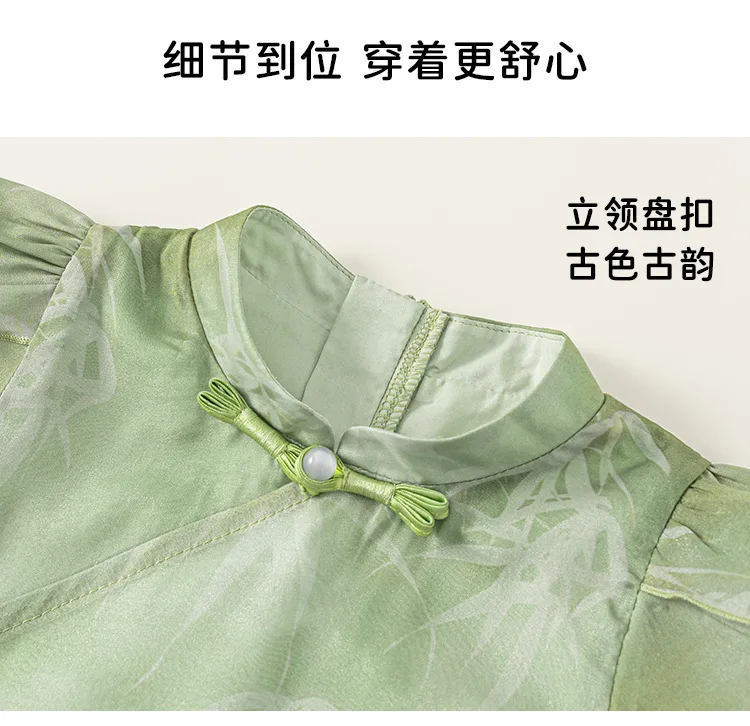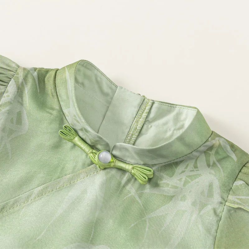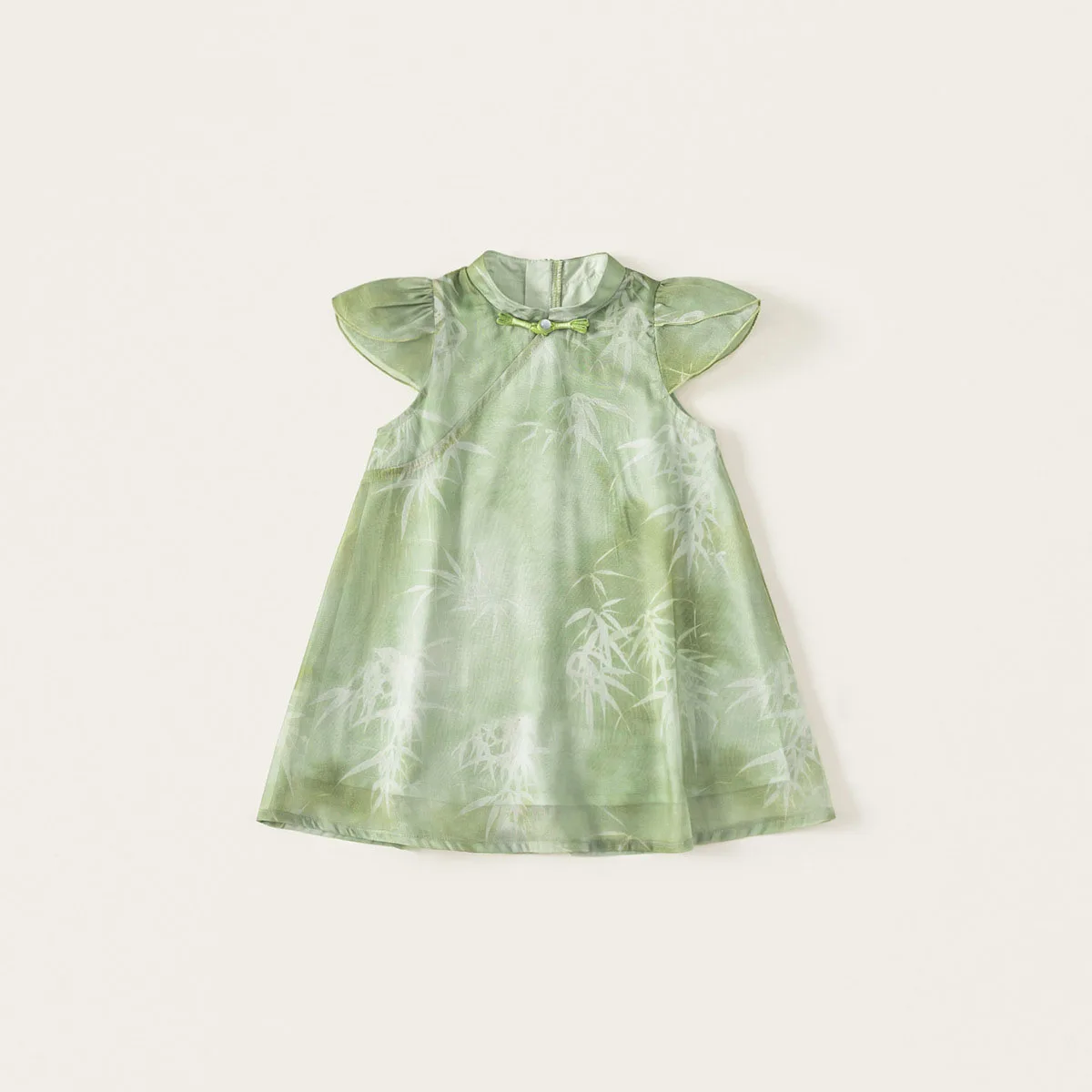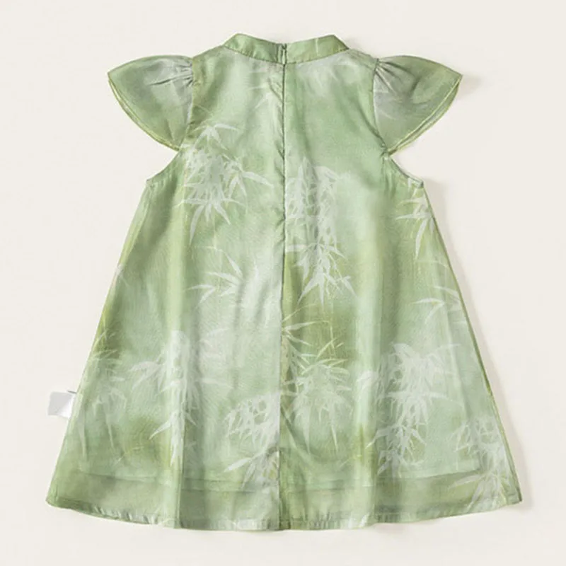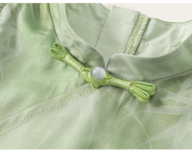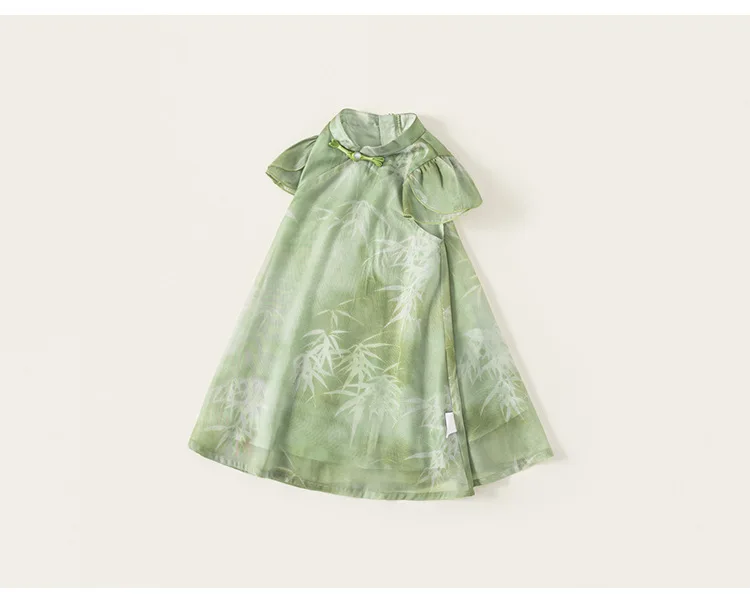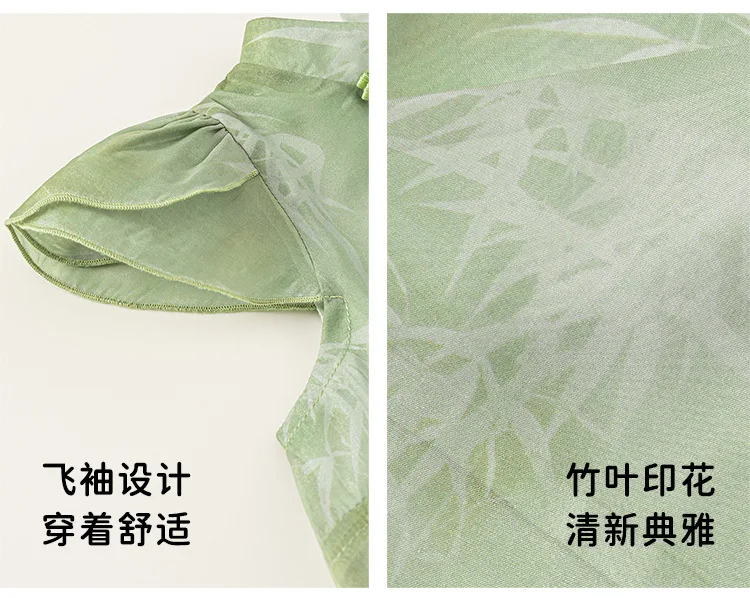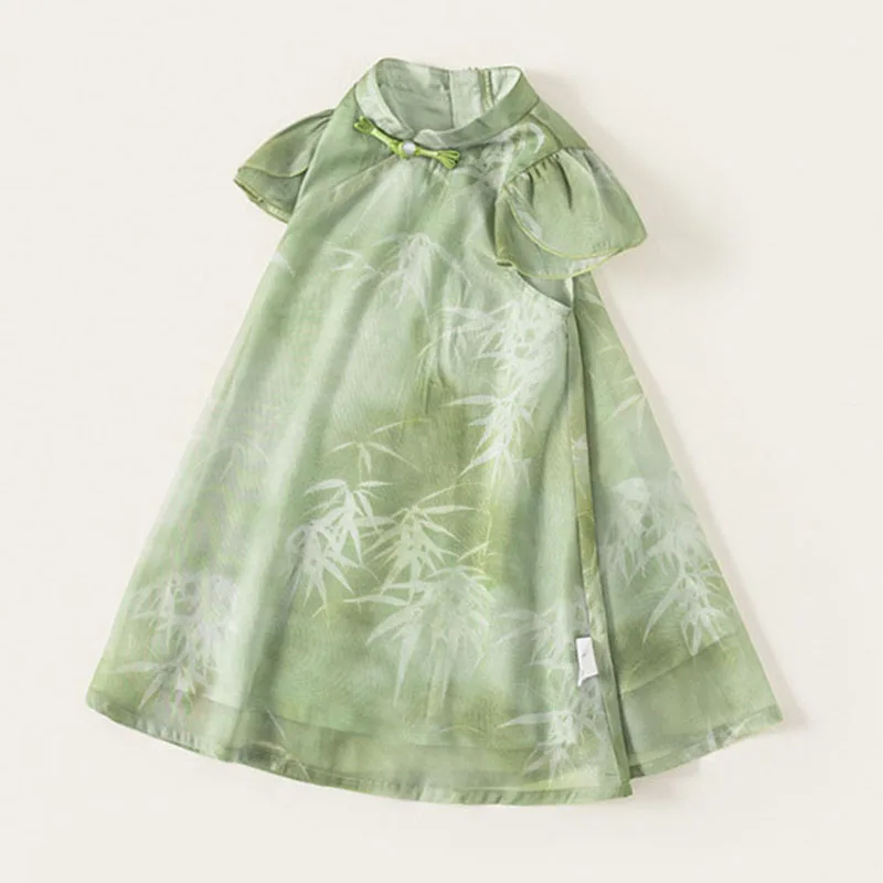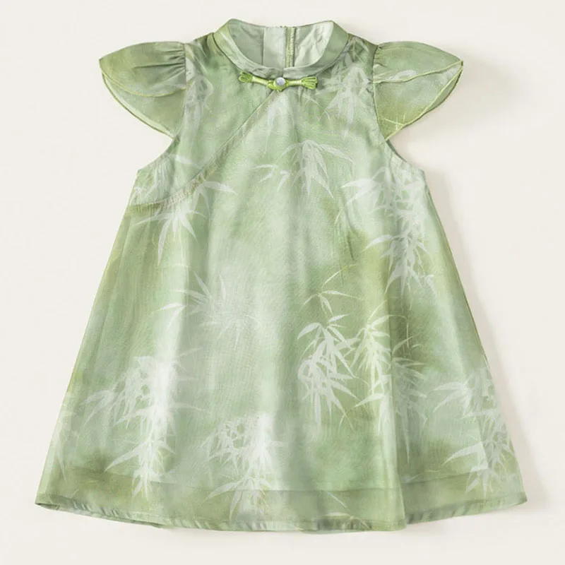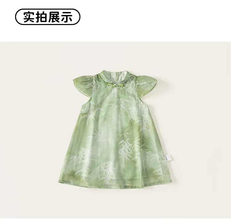 2025 ropa de verano para niñas, vestidos de bebé de estilo chino, Cheongsam verde, moda con estampado bonito, vestido de princesa de malla sin mangas B172
