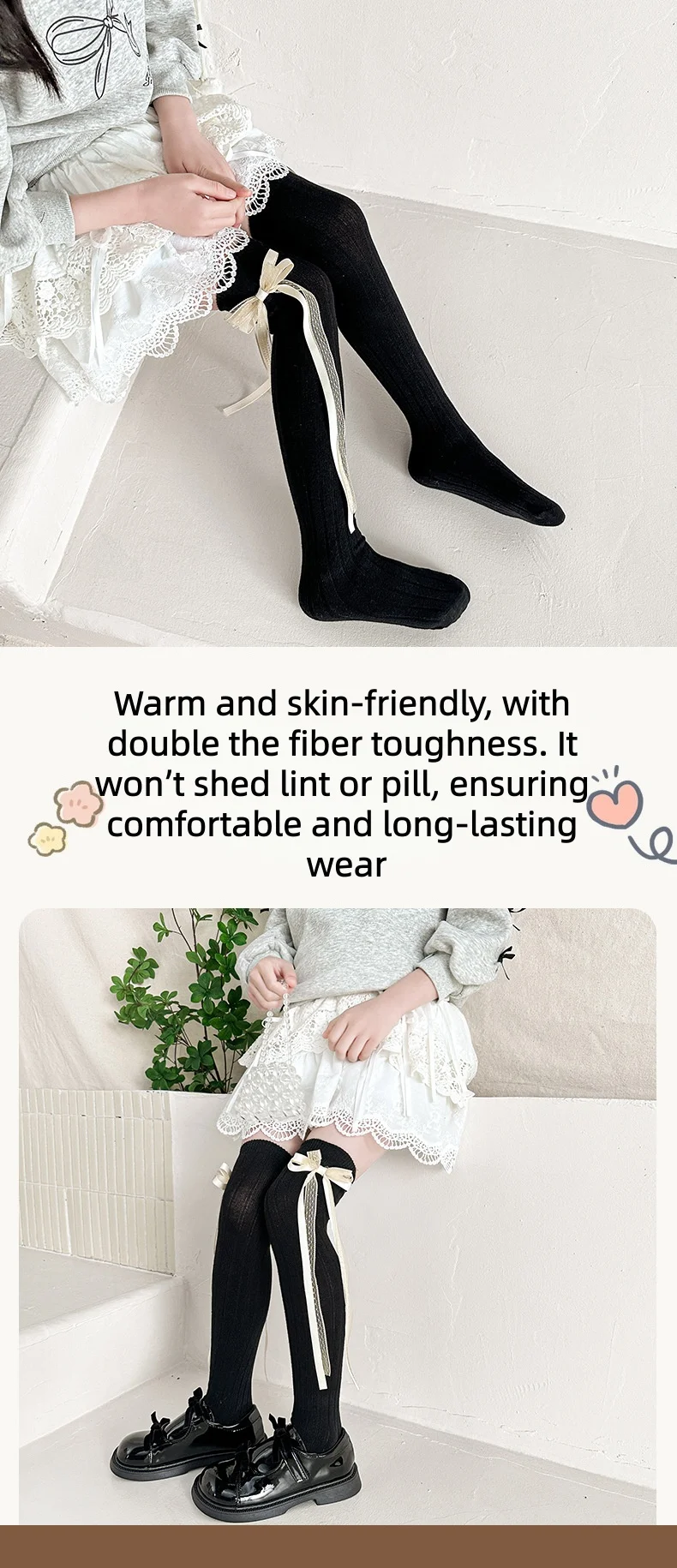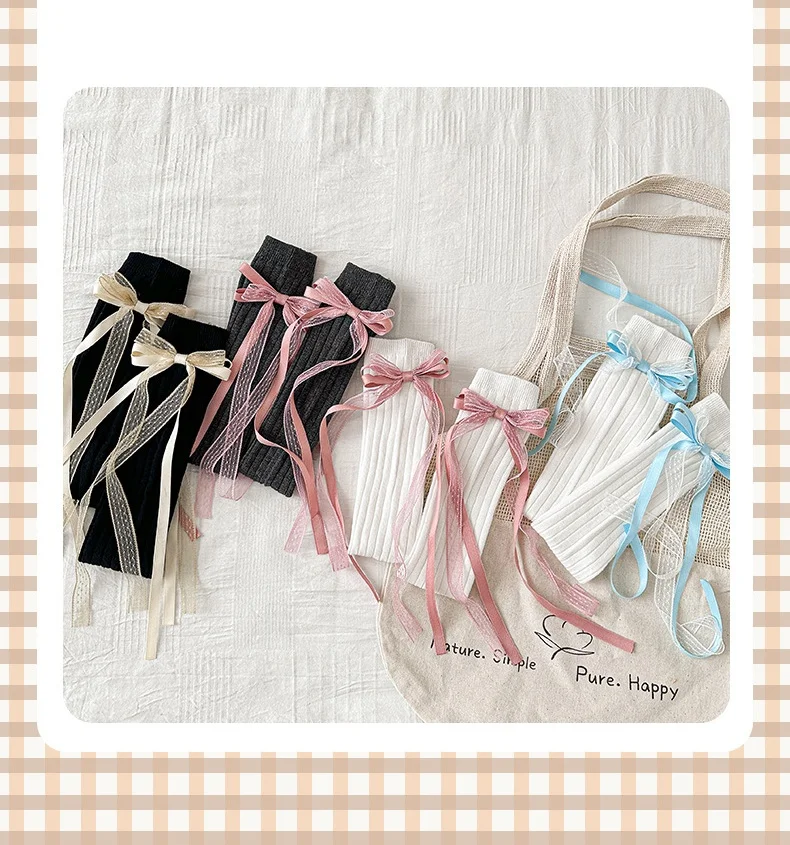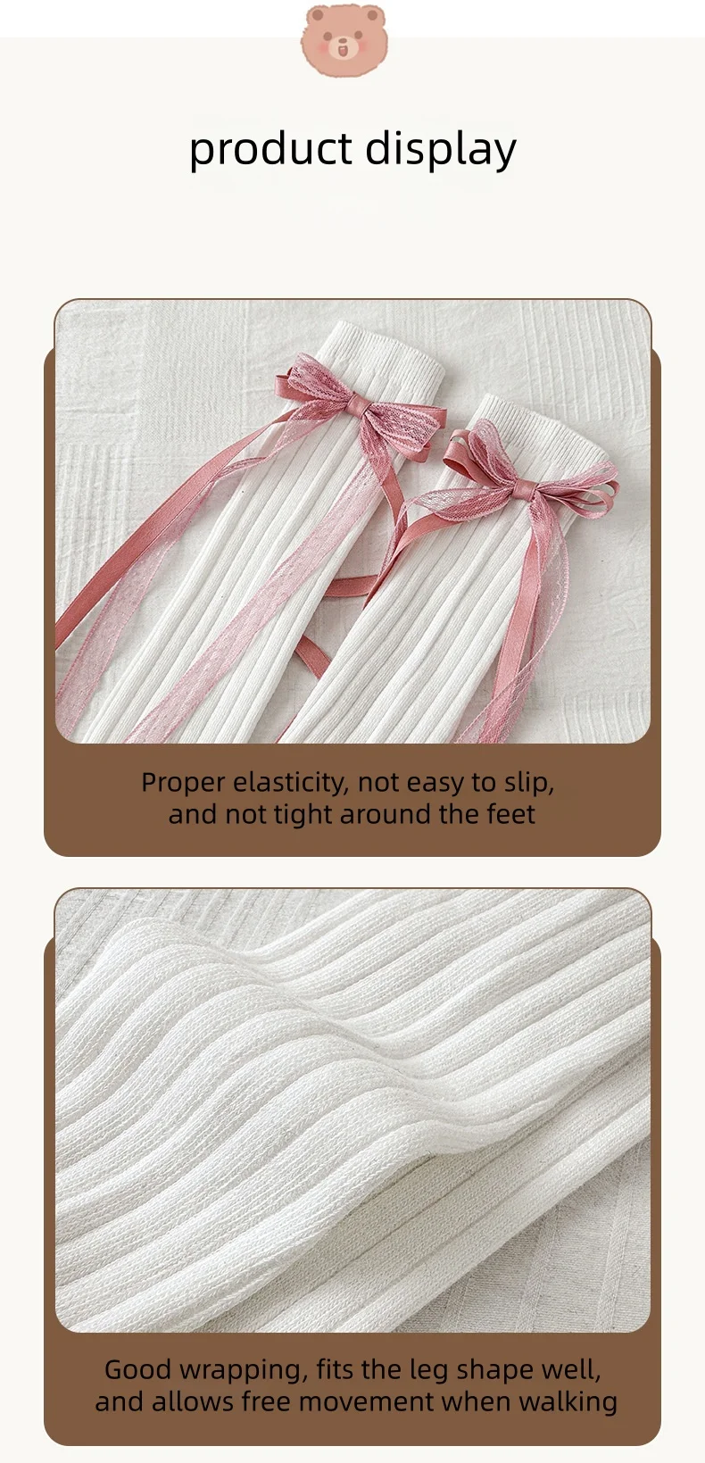 1. Encantador diseño de borla de lazo largo: el elegante lazo largo (con ribete de borla) agrega detalles dulces y llamativos, lo que hace que los calcetines sean perfectos para combinar vestidos o lindos atuendos diarios.