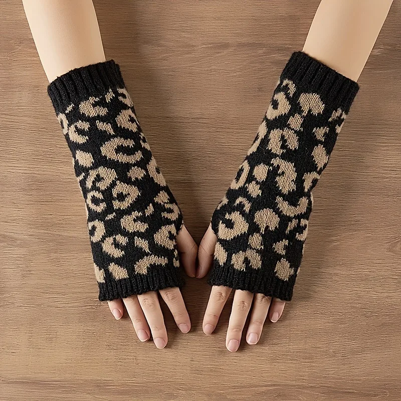2026 Nuevos guantes de punto con estampado de leopardo para mujer: color beige, tela de poliéster suave, sin pantalla táctil, uso diario cálido y moderno