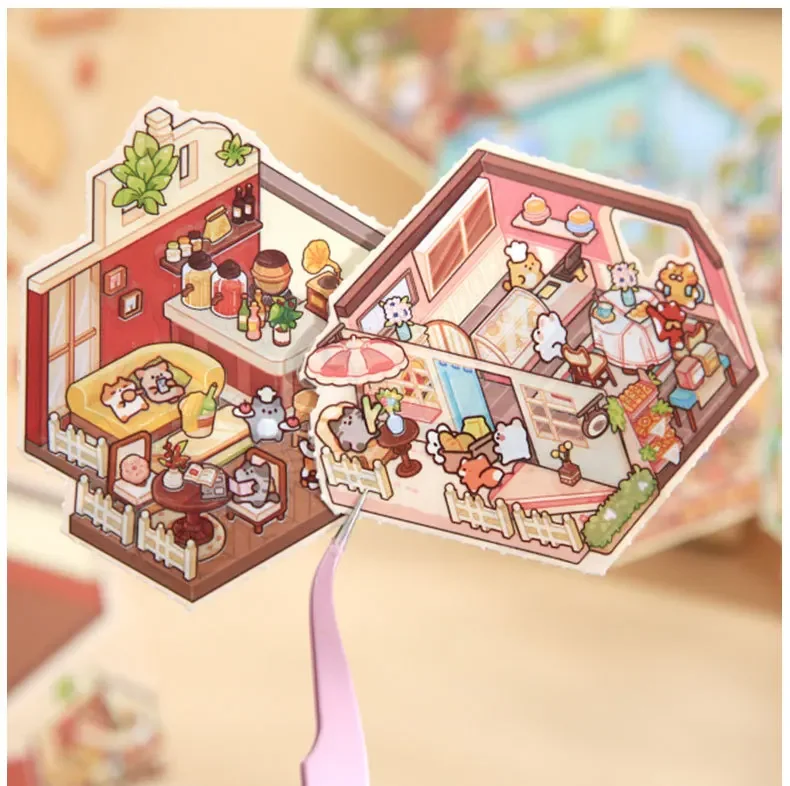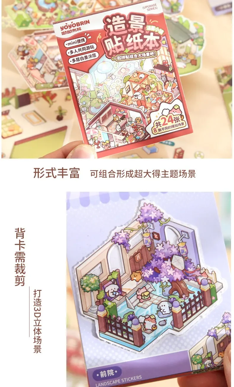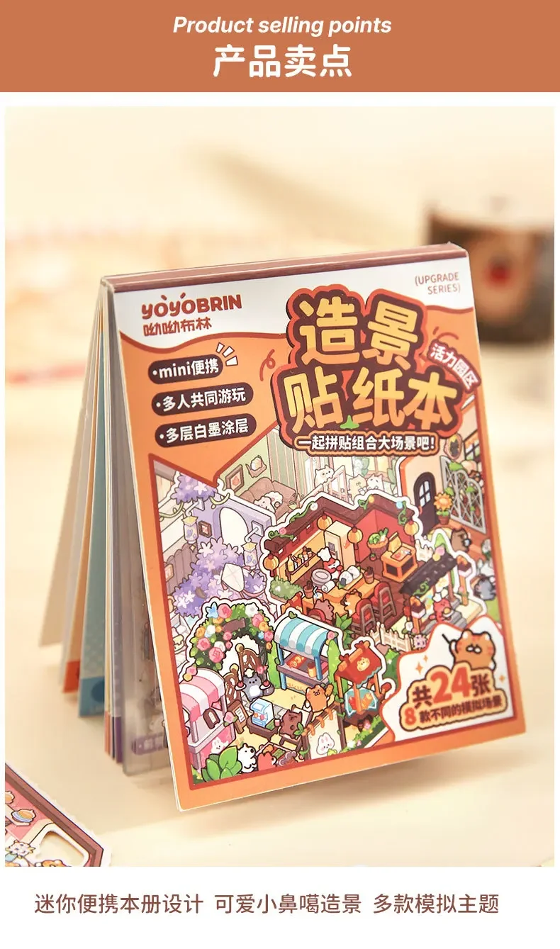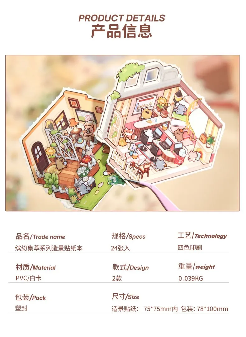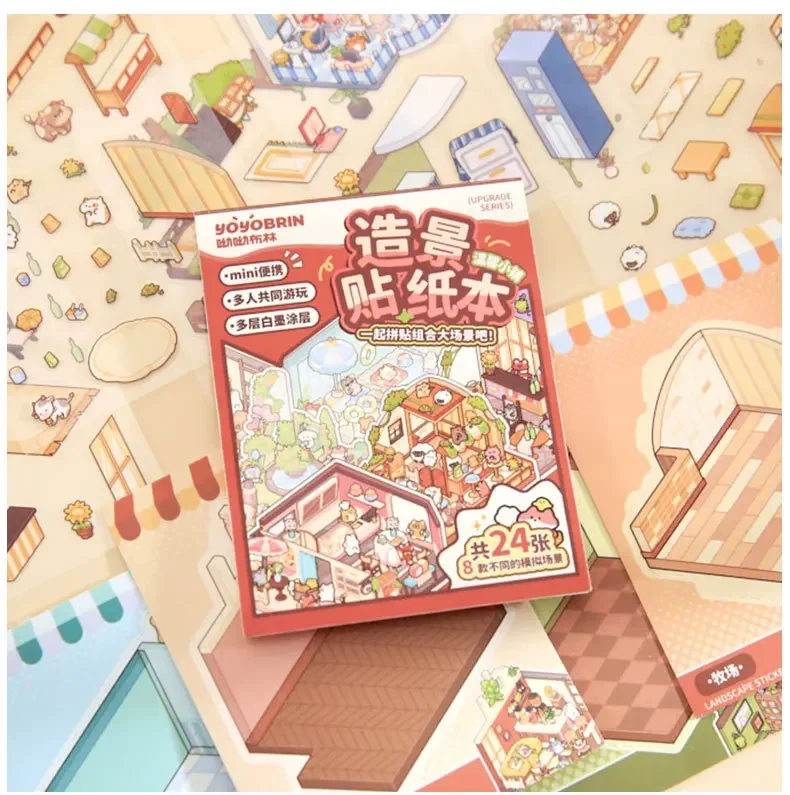 24 hojas de escenas de dibujos animados, libro de pegatinas de paisaje, área de comedor de oficina, pegatina 3D DIY, escena de cabina, bolsillo, regalo de cumpleaños