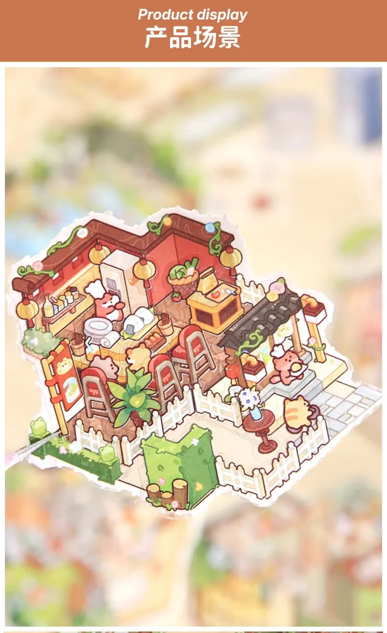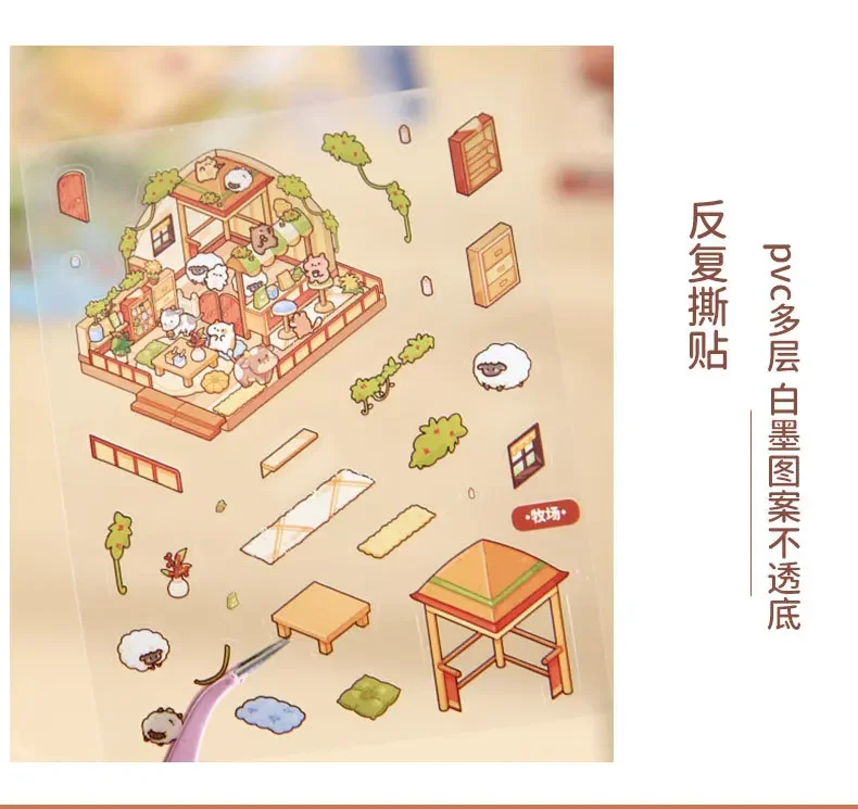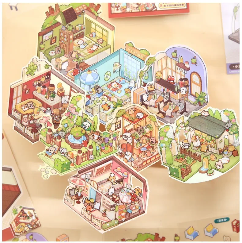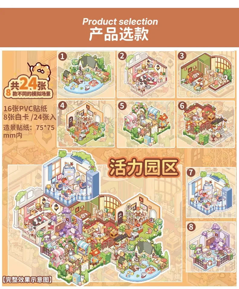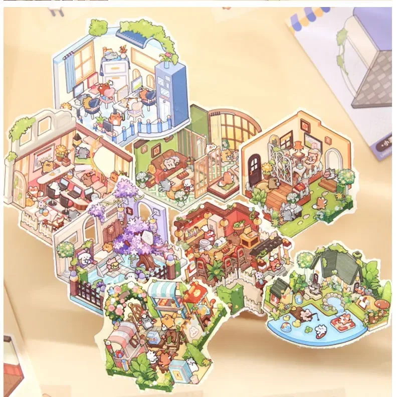 24 hojas de escenas de dibujos animados, libro de pegatinas de paisaje, área de comedor de oficina, pegatina 3D DIY, escena de cabina, bolsillo, regalo de cumpleaños