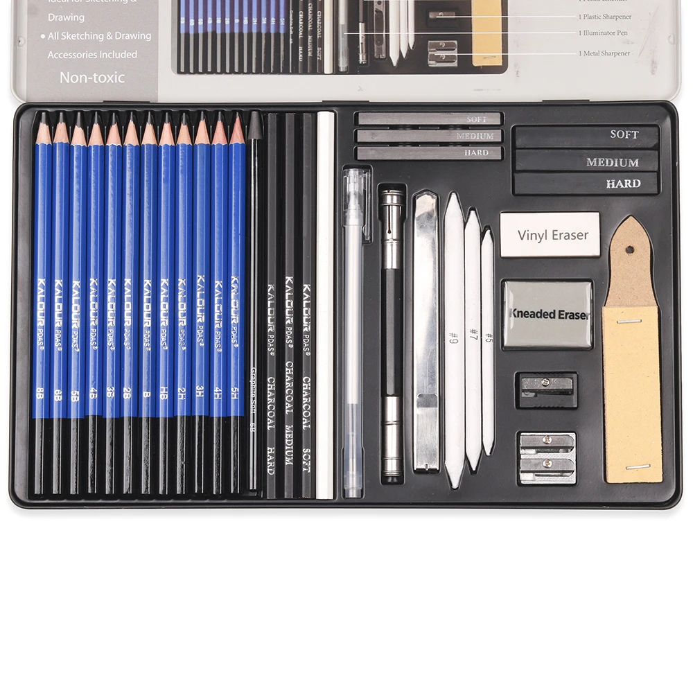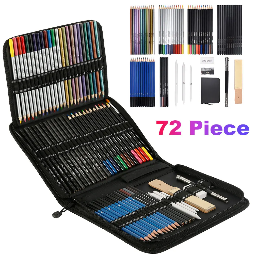 JUEGO DE DIBUJOS DE 96 ARTISTAS DE: consta de 72 lápices de colores (sin. En el cuerpo del lápiz), 12 lápices de dibujo (5H 4H 3H 2H HB B 2B 3B 4B 5B 6B 8B); 3 lápices de carbón (suave, medio, duro), 1 lápiz de grafito (6B), 8 accesorios de dibujo (3 tocones de mezcla, 1 sacapuntas de metal, 1 Borrador de vinilo, 1 extensor de lápiz, 1 bloque de papel de lija, bloc de dibujo 1);