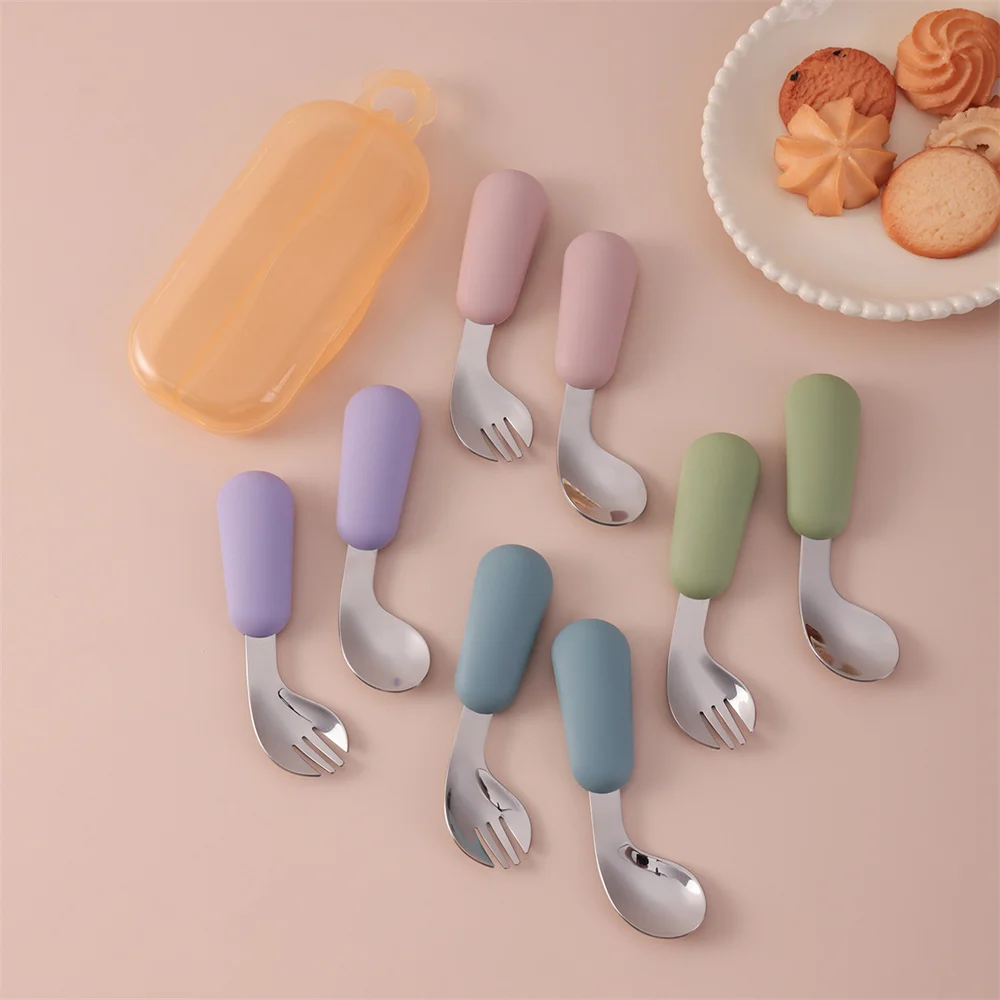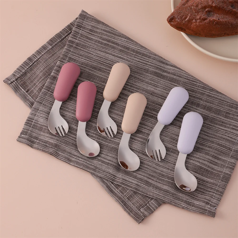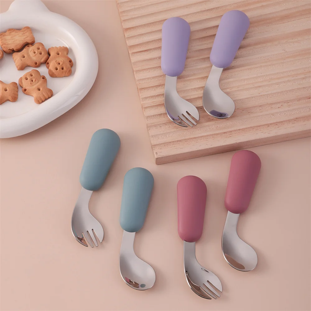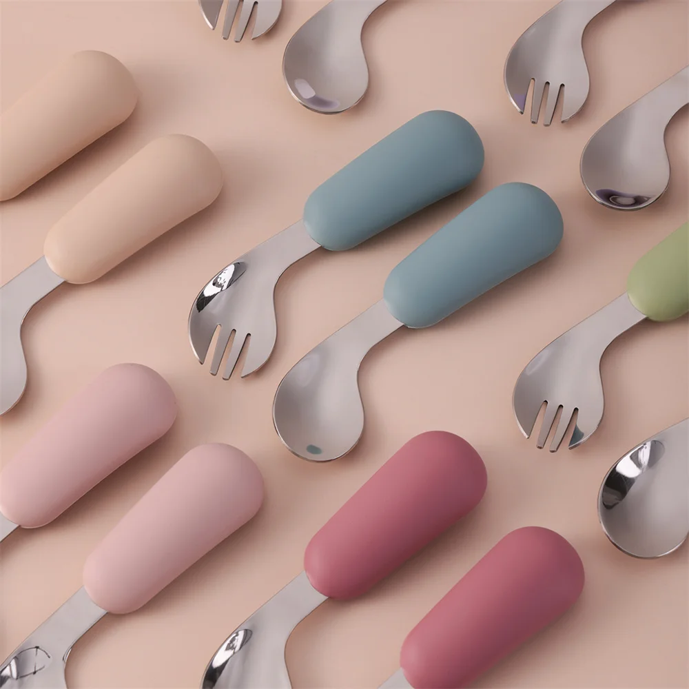 Color niños 2 uds conjunto de alimentación automática de silicona cuchara de acero inoxidable tenedor agarre entrenador sin BPA elementos esenciales para bebés artículos para recién nacidos