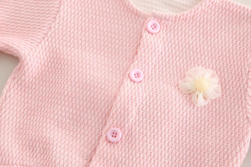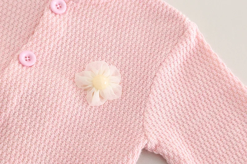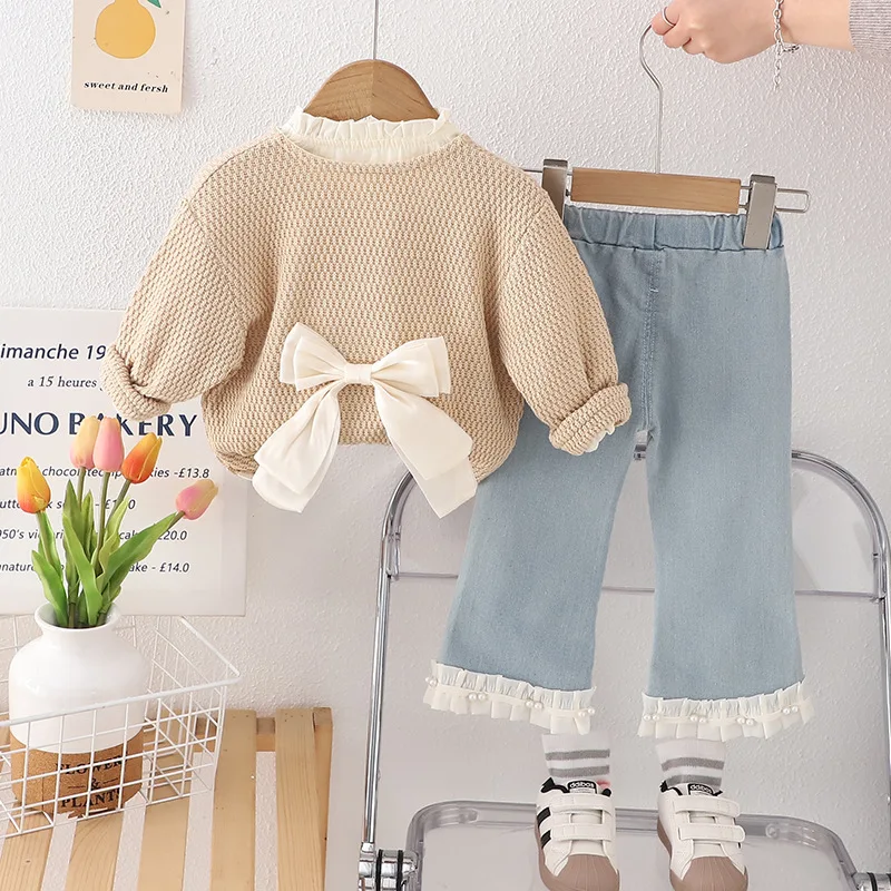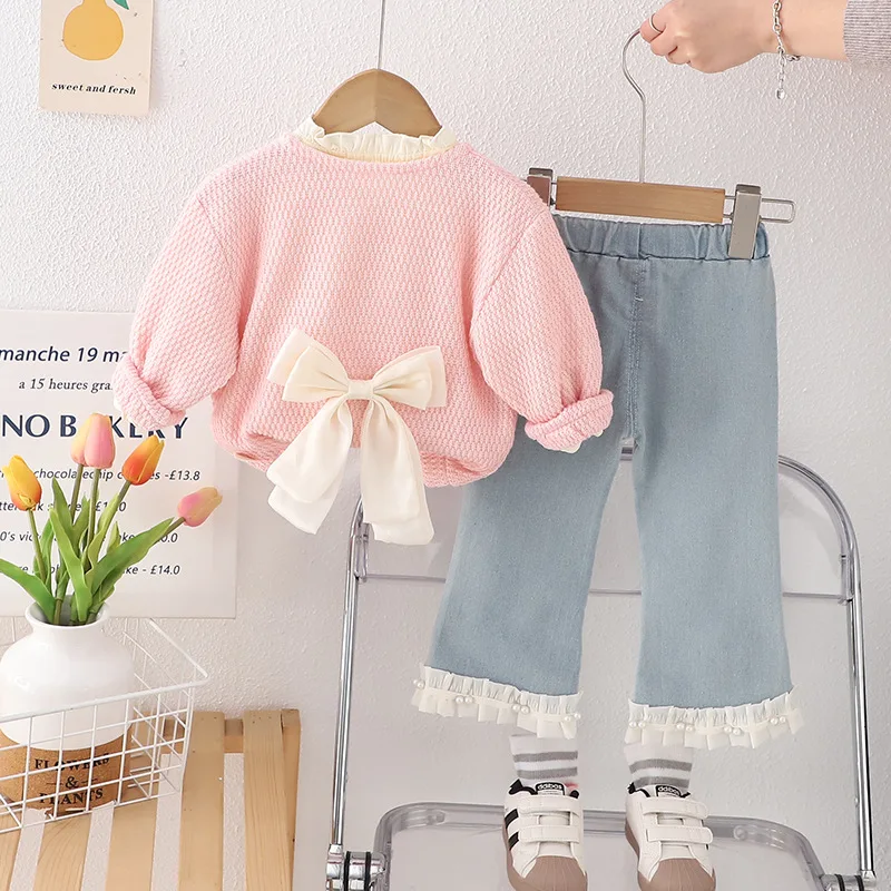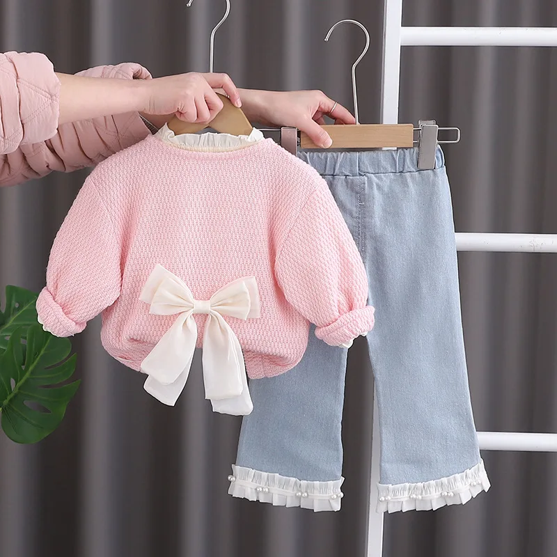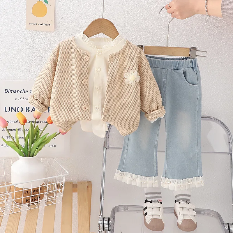 3 piezas 2025 primavera otoño ropa para niños niñas moda coreana Linda flor tejida rosa bebé Tops + camiseta + pantalones vaqueros conjuntos para niños BC2262