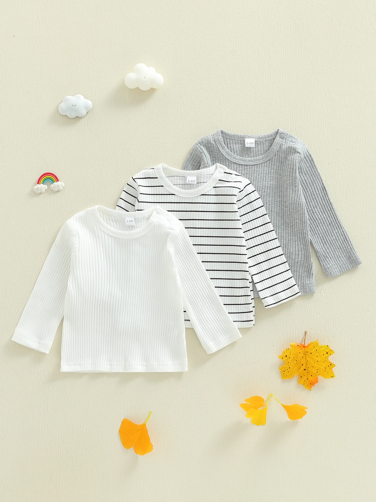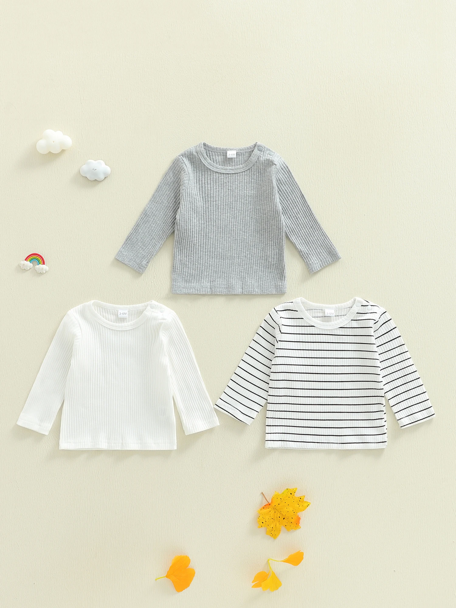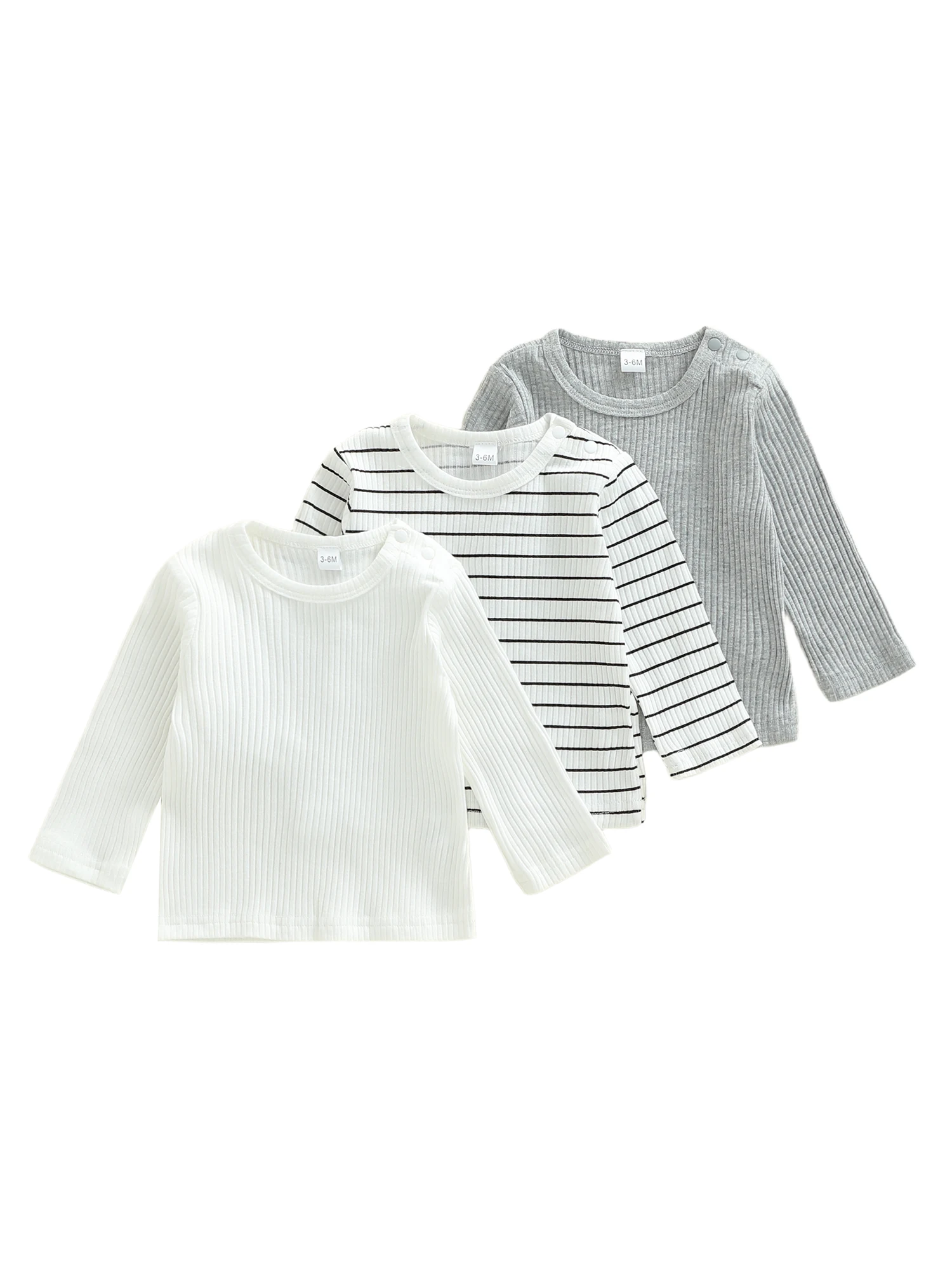 Comprar 3 piezas bebé niña niño tops otoño cuello redondo manga larga color sólido/camisas de capa base acanalada a rayas