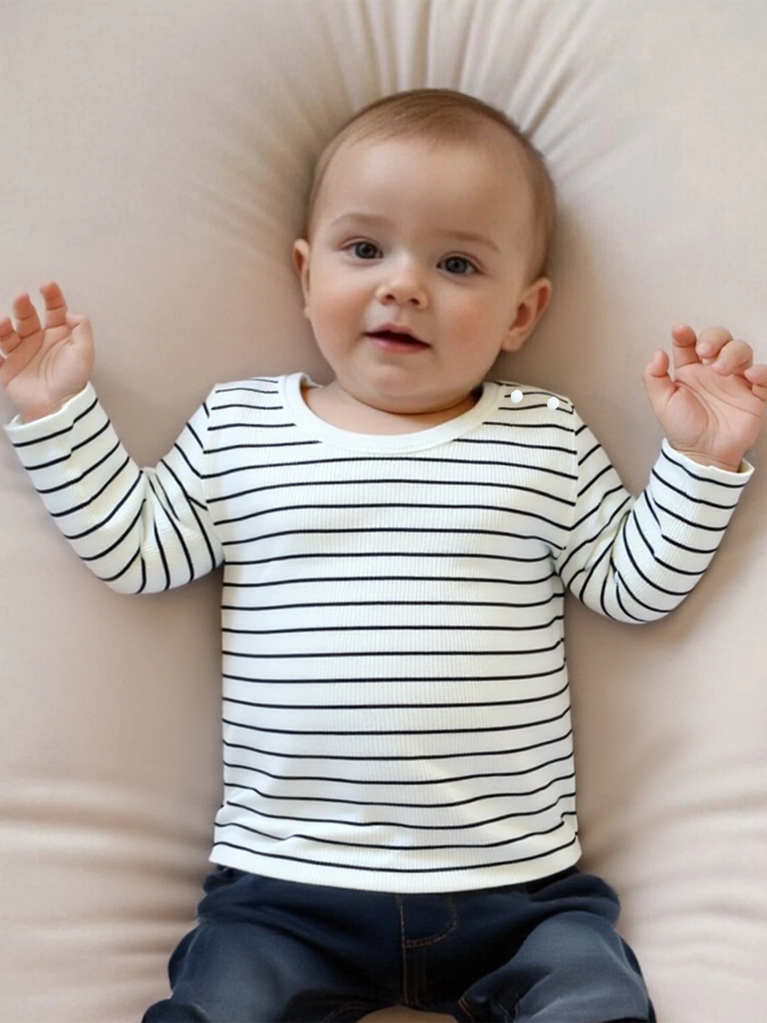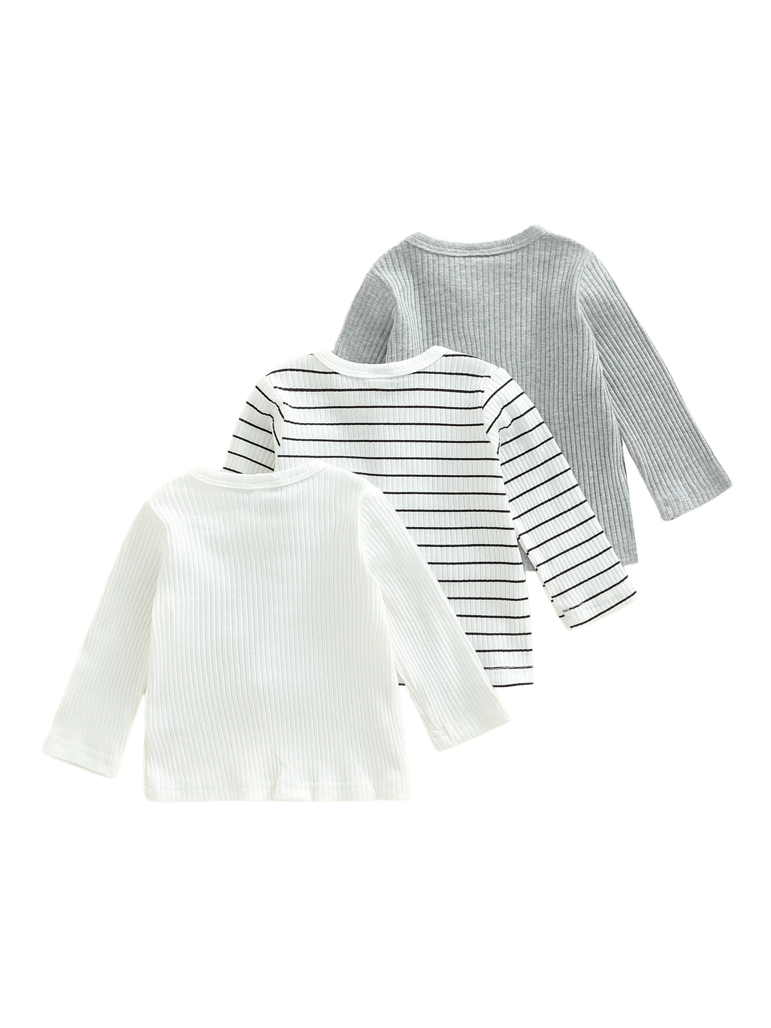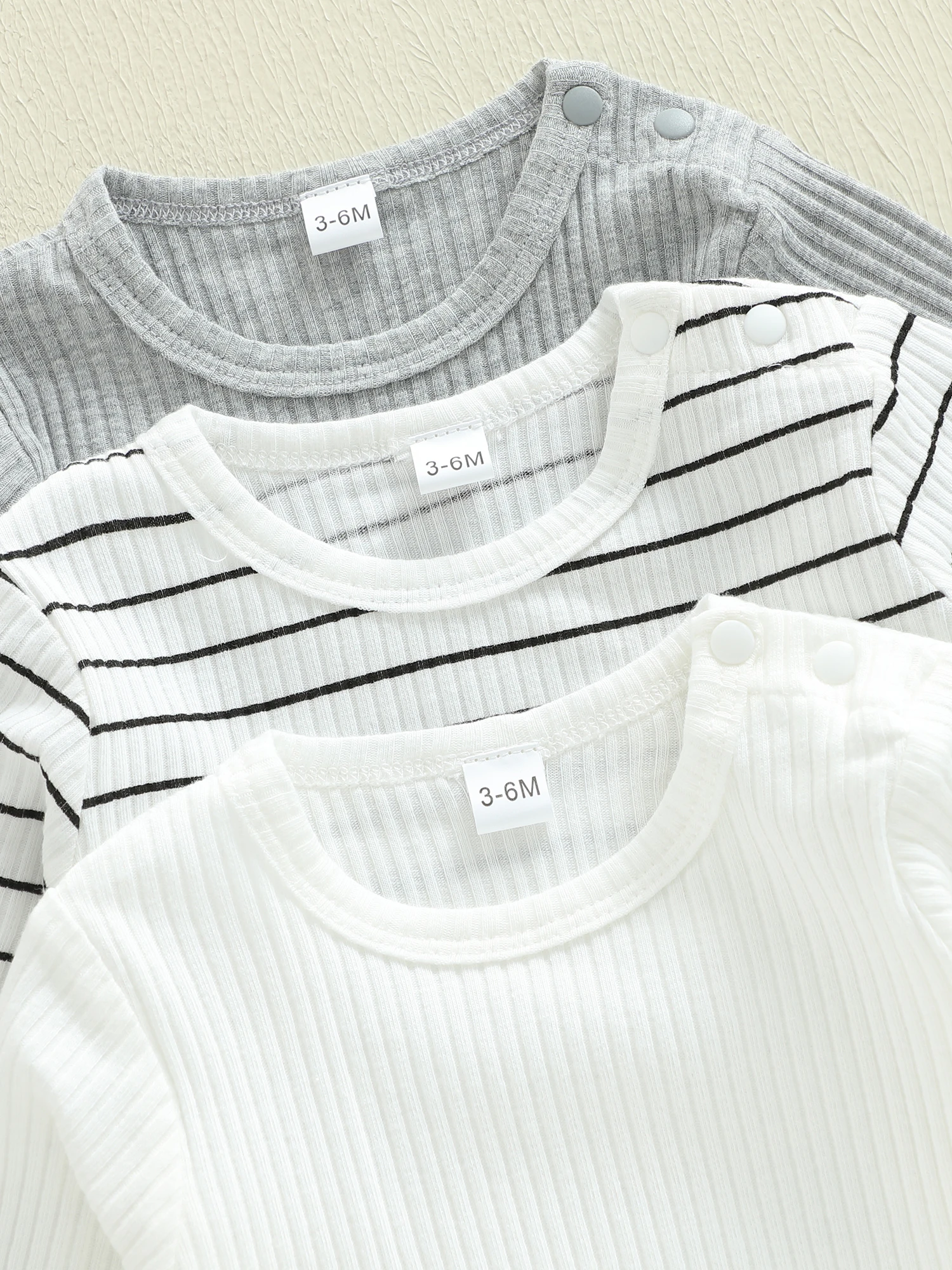 Comprar 3 piezas bebé niña niño tops otoño cuello redondo manga larga color sólido/camisas de capa base acanalada a rayas