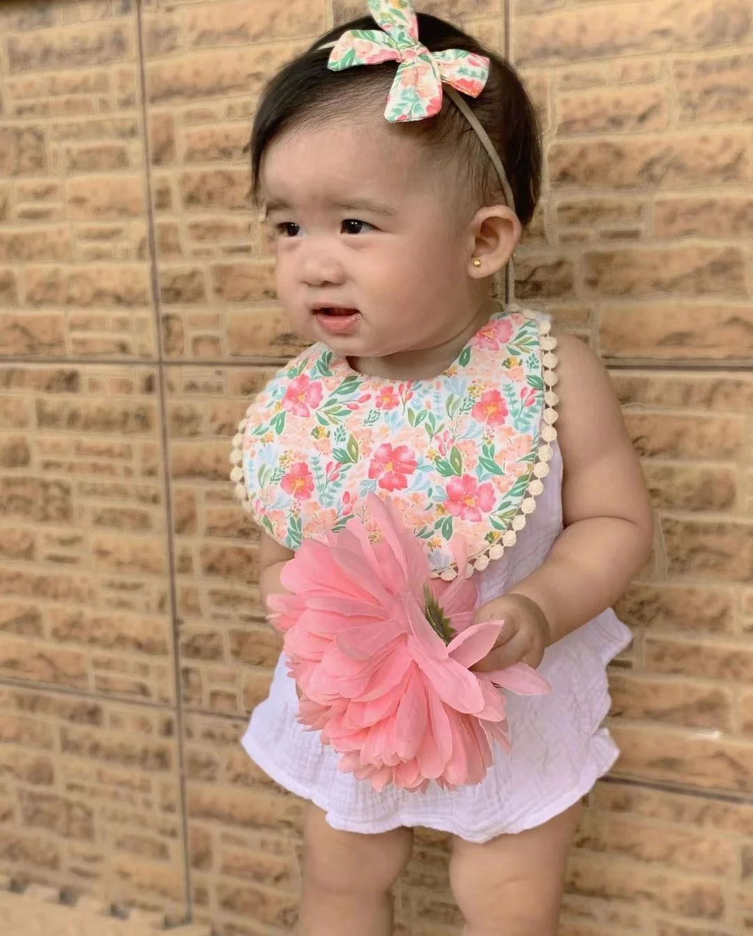 Comprar 3 unids/set de Baberos de lino y algodón con estampado de flores para bebé, niño y niña, diadema de nailon elástico, toalla para Saliva de dos pisos, Bandana de alimentación, delantal para eructar