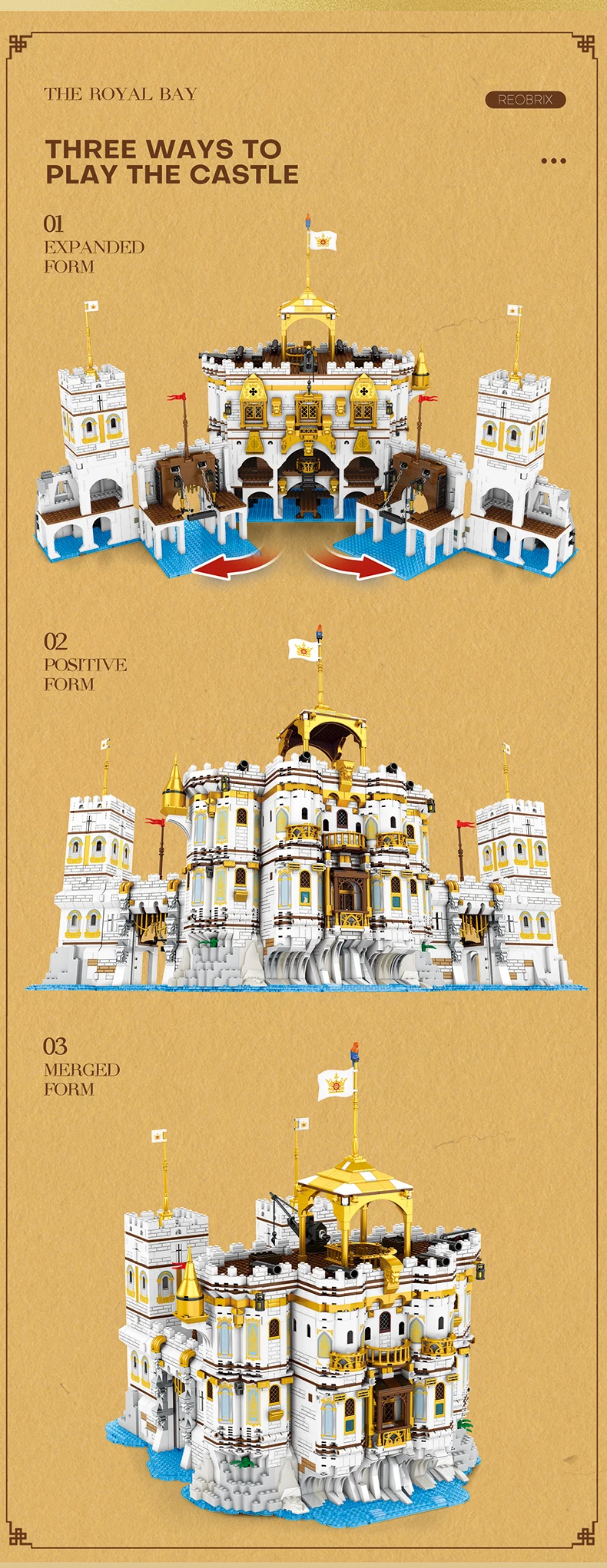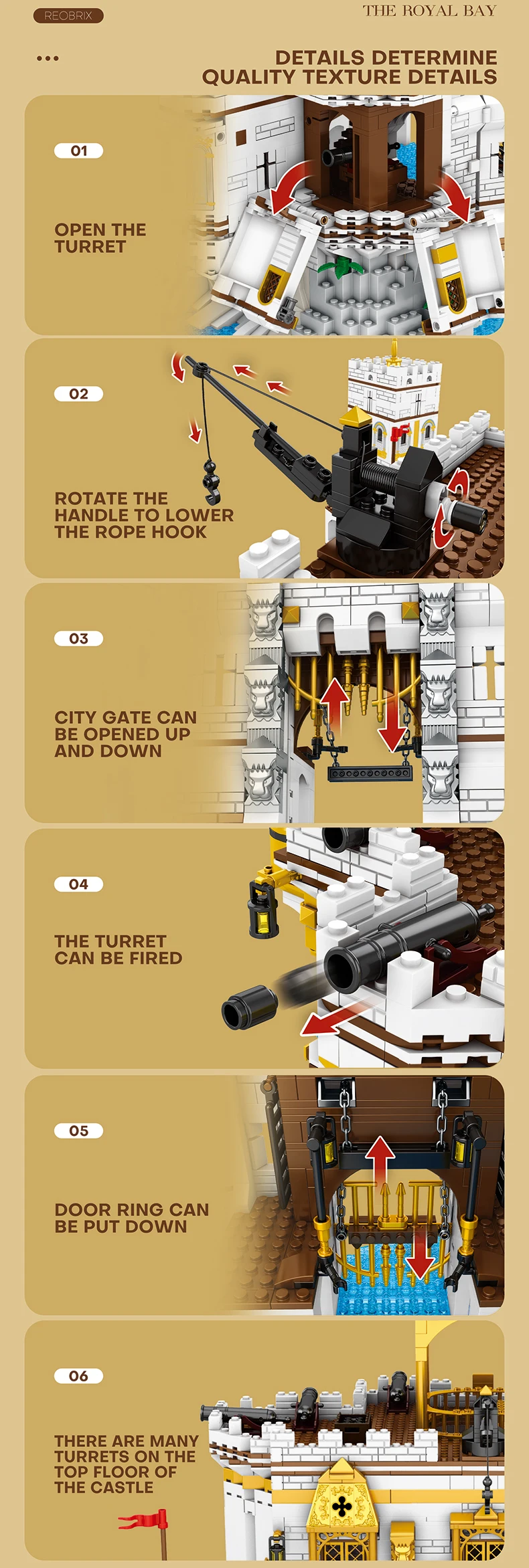 ✨Ricas funciones mecánicas interactivas: Diseñado con múltiples mecánicas jugables: se pueden levantar ambas puertas laterales de la ciudad, el interior del castillo se despliega para una exploración en profundidad y la grúa superior es móvil para un transporte de carga simulado.El segundo piso de la torre se abre para revelar una batería giratoria, y los cañones pueden lanzar "bolas de canhão", convirtiendo el ensamblaje estático en una dinámica diversión medieval.