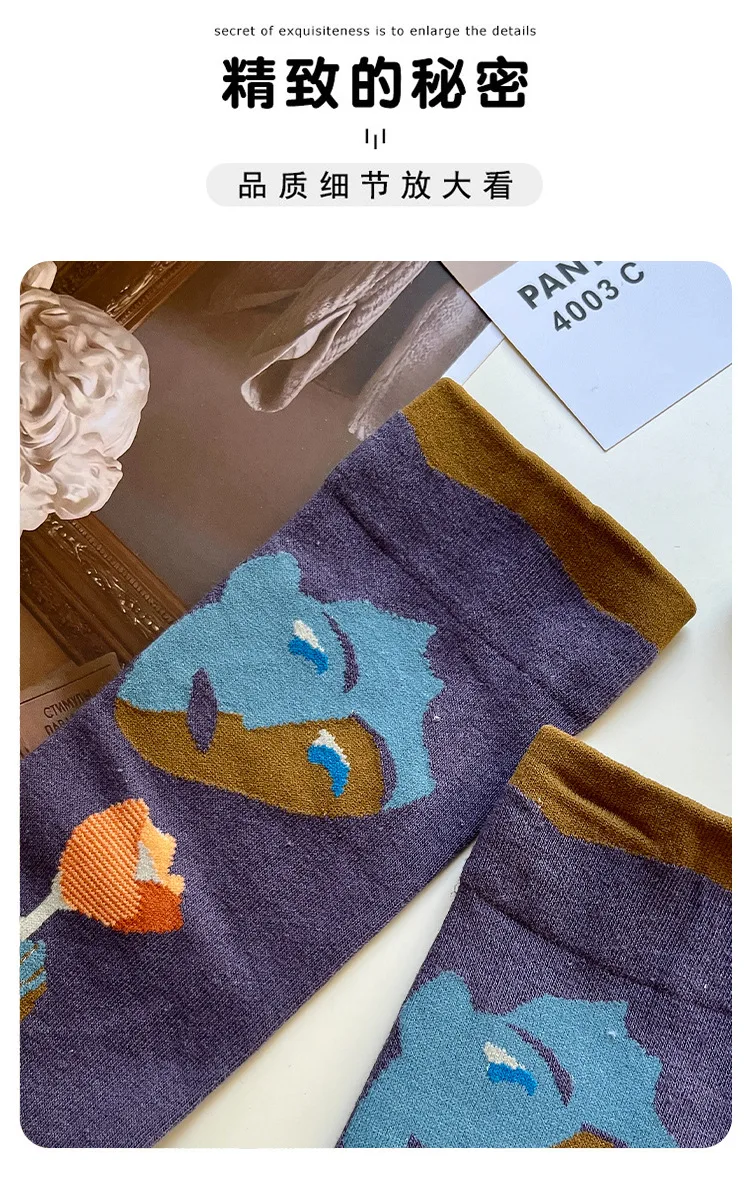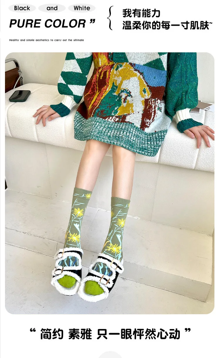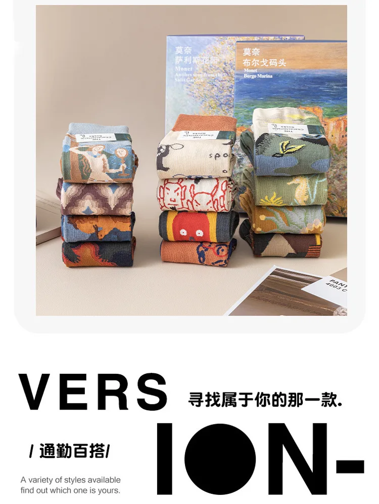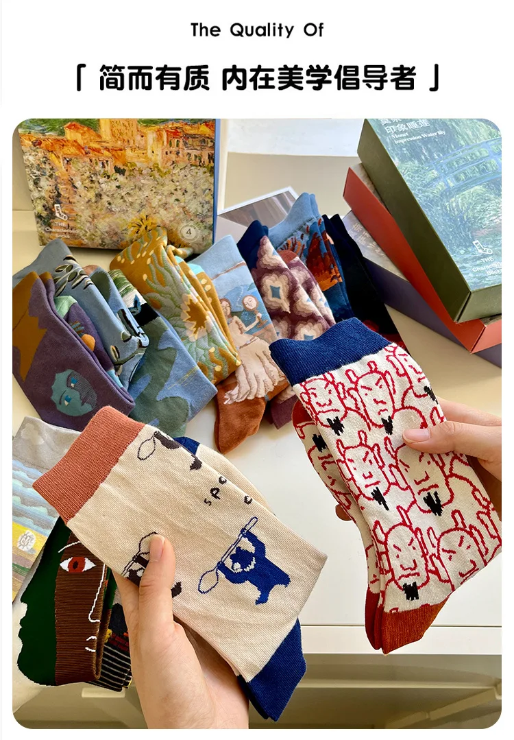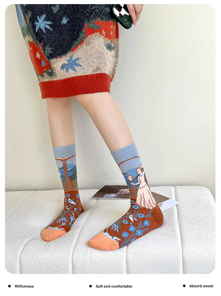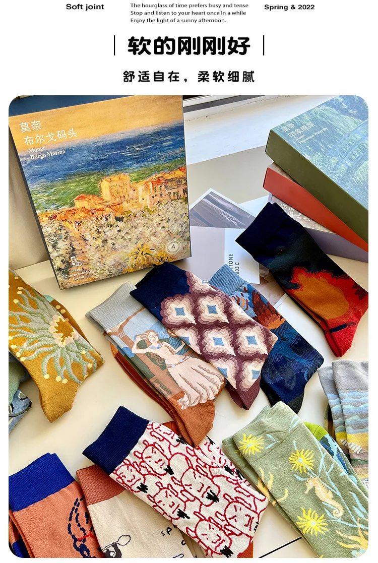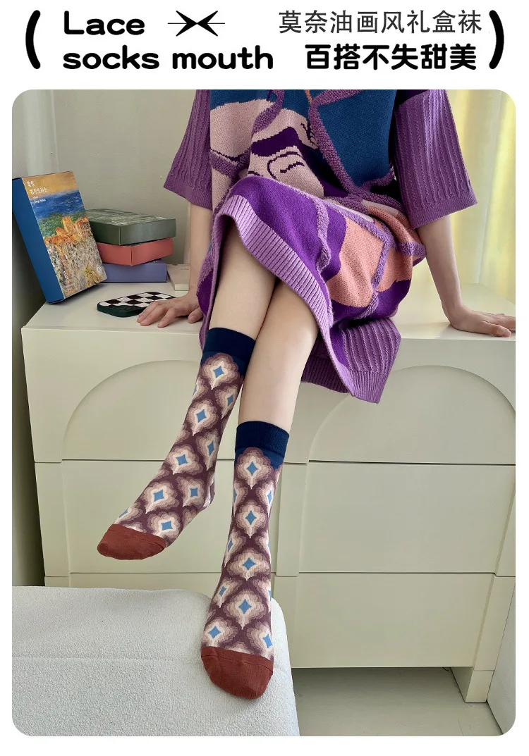 4 Uds Serie Monet calcetines de lona estilo mujer Otoño Invierno moda Retro calcetines de longitud media medias de algodón accesorios de ropa