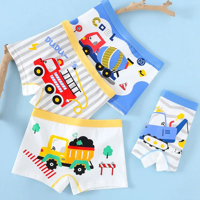 4 unids/lote de ropa interior para niños, Boxers de algodón suave para niños, exquisitos camiones de dibujos animados, calzoncillos Boxer transpirables con estampado para niños 2-9T