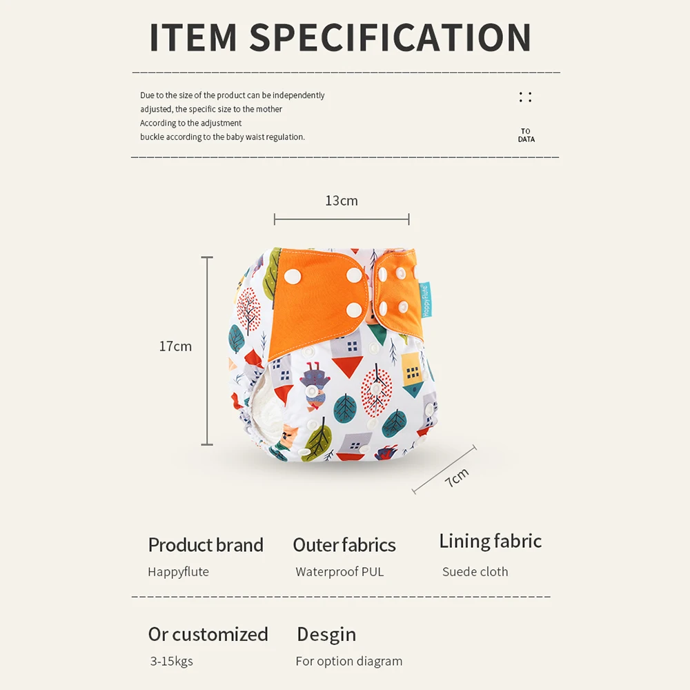 Tamaño apto para bebés de 3-15kg Material: Capa exterior: PUL estampado impermeable Interior: Tela de gamuza Bolsillo de secado rápido: Una Apertura trasera Instrucciones de cuidado: lave los pañales de tela por separado de otros pañales ¿Cuántos pañales necesita? -Recién nacido a 4 meses -- 20 ~ 30 pañales-Infante (4 a 10 meses) -- 20 ~ 25 pañales-Niño (más de 10 meses) -- 15 ~ 20 pañales