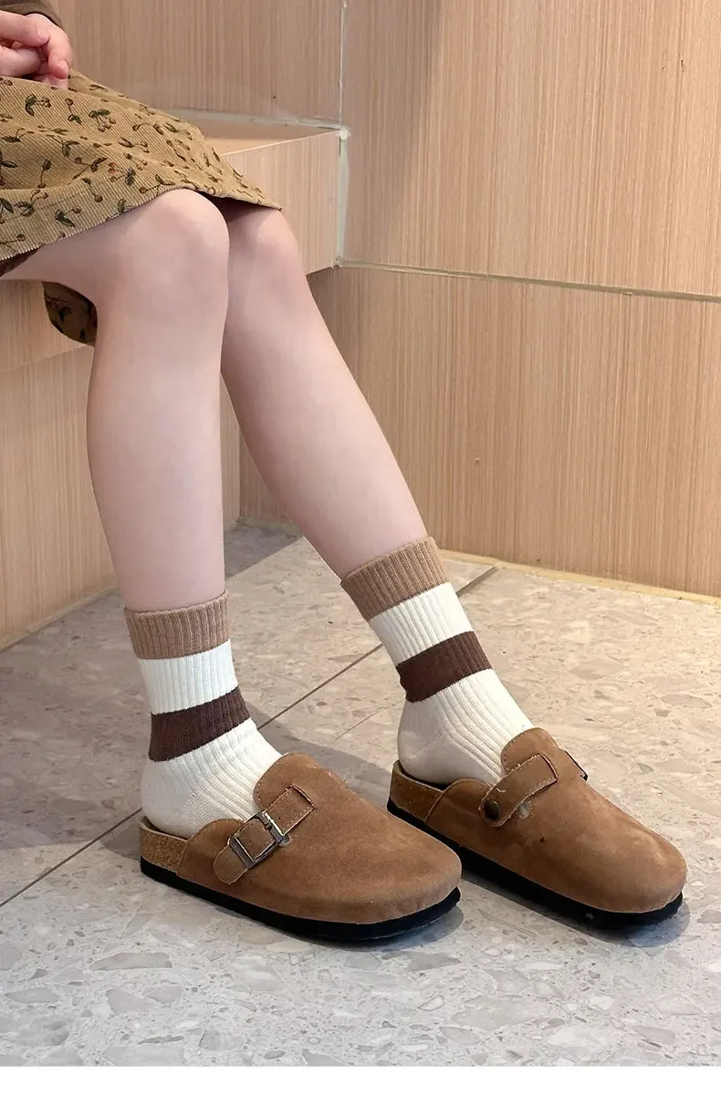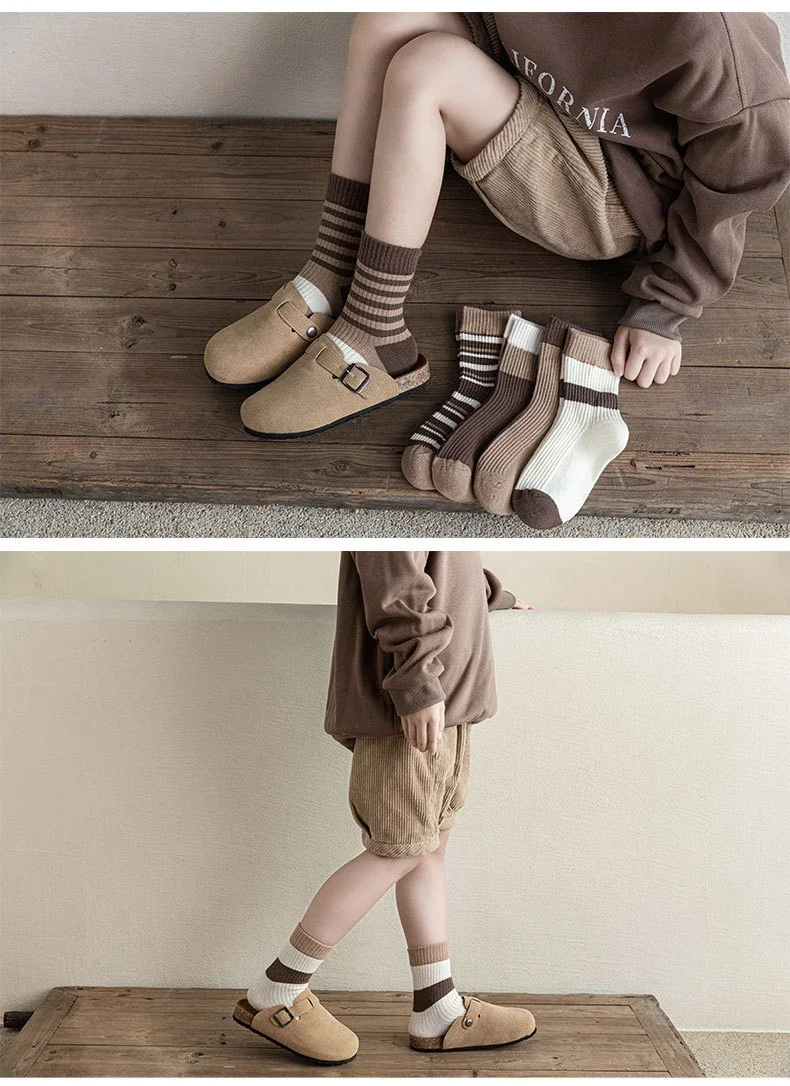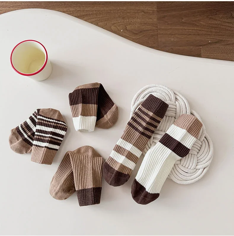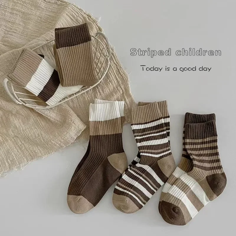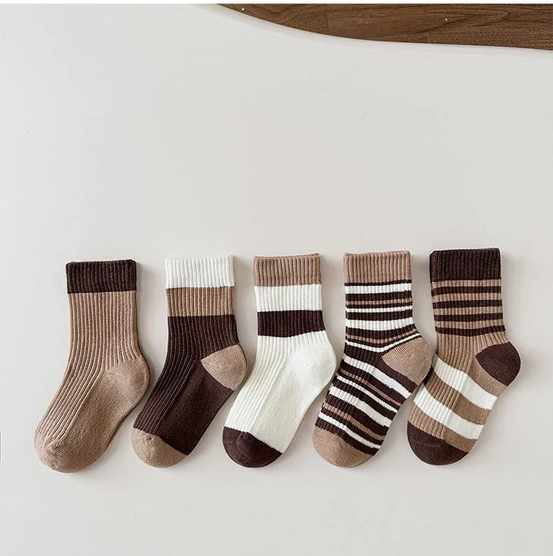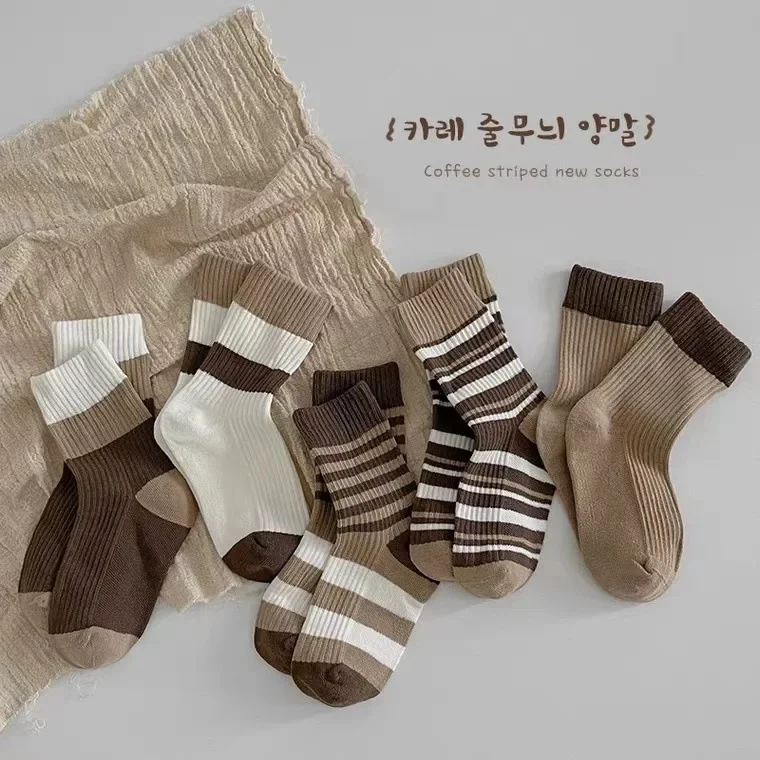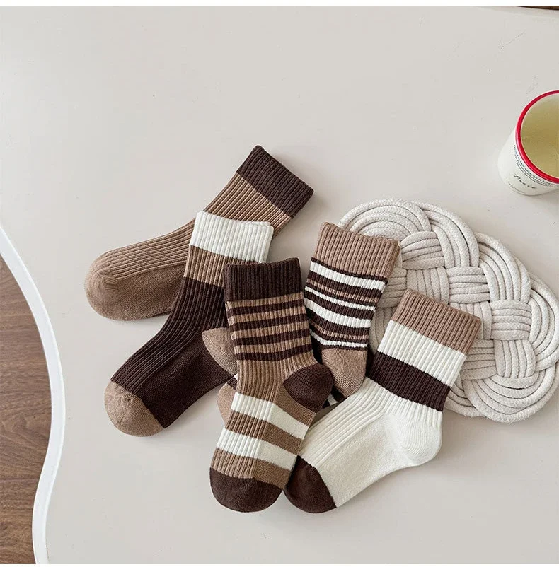 5 par/set de calcetines de pantorrilla de Color café Beige para niños, calcetines deportivos a rayas a la moda para niños, calcetines escolares de algodón suave para primavera y otoño