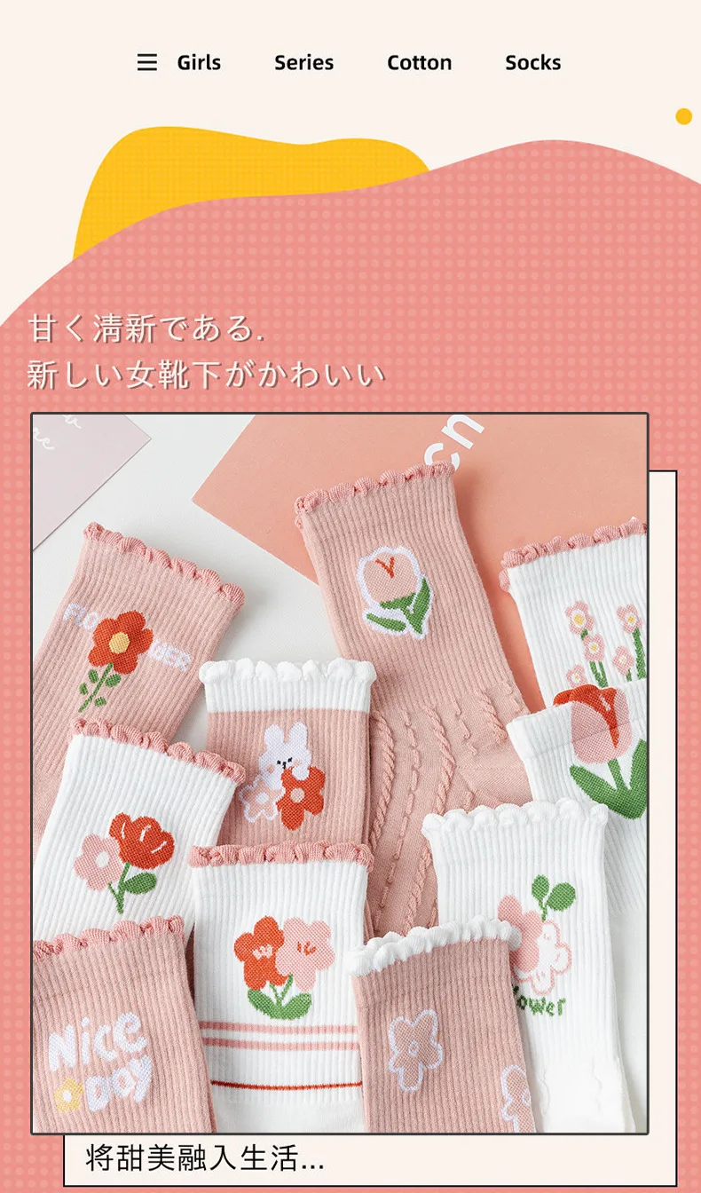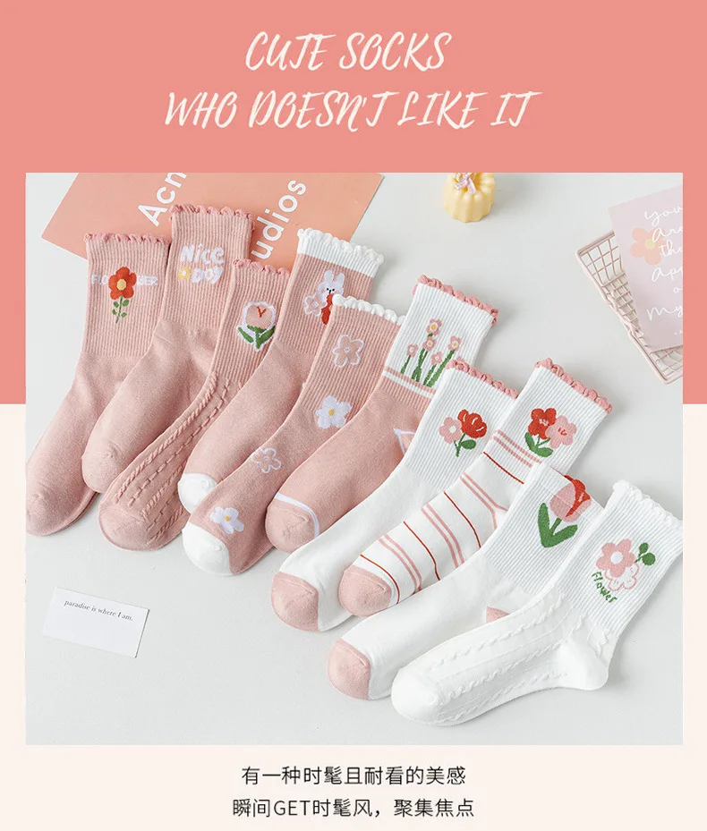 Comprar 5 pares de calcetines de algodón suave para niñas, calcetines rosas con estampado de flores y flores para niñas, calcetines cálidos de tubo medio para otoño e invierno