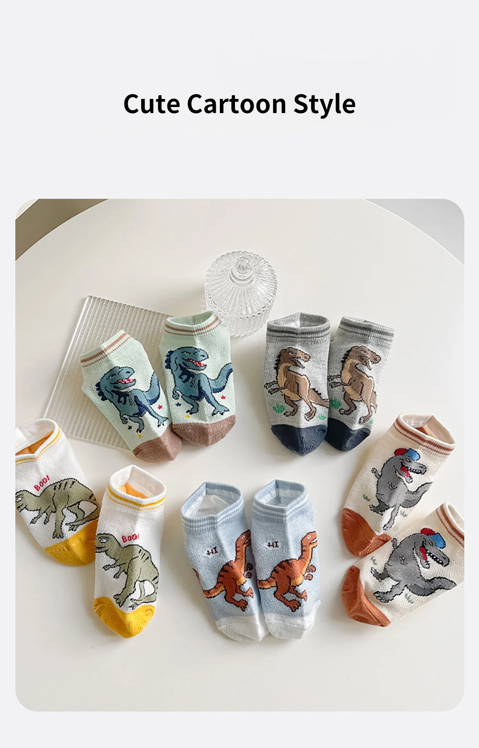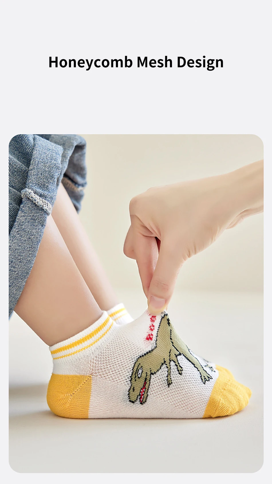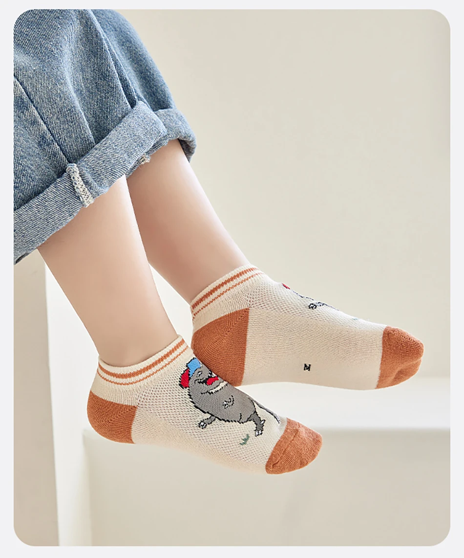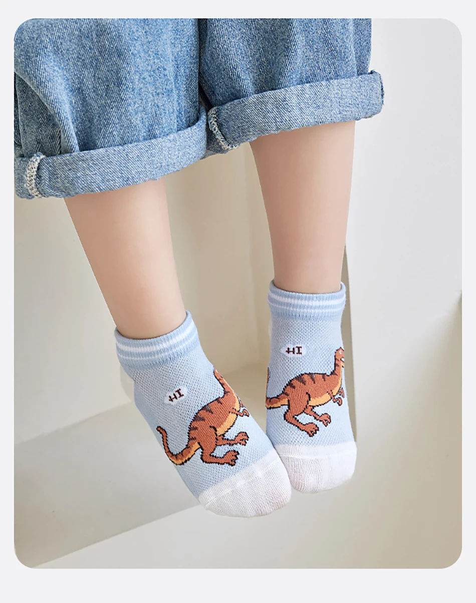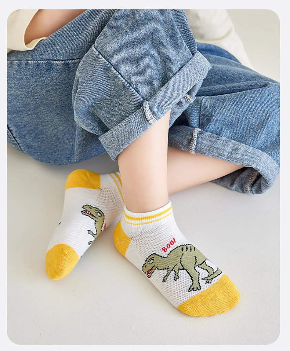 Nombre: 5 pares de calcetines finos y transpirables de dibujos animados de dinosaurios para niños, adecuados para primavera y verano, malla para clima fresco, diseño cómodo máximo