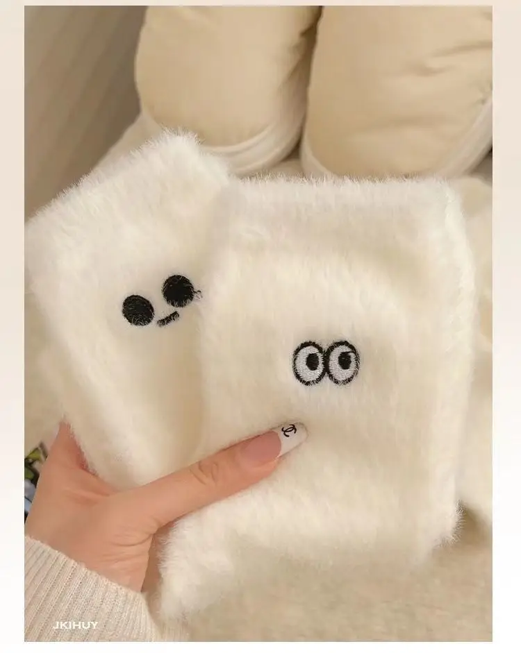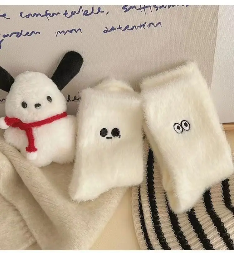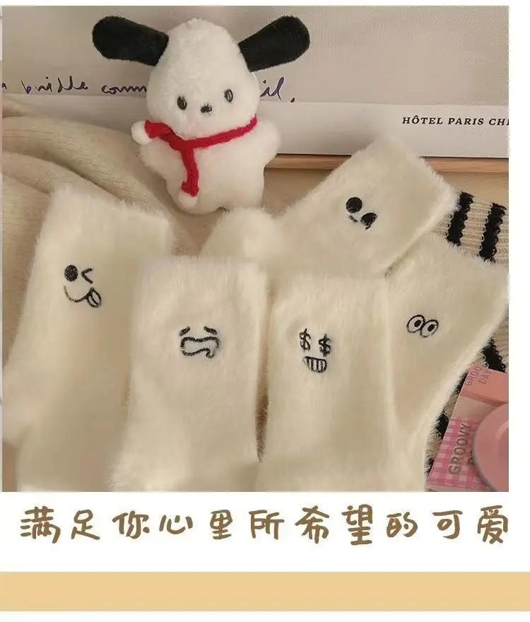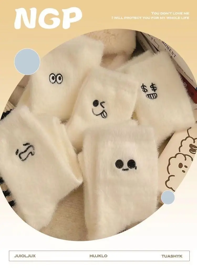 5 unids/set de calcetines de invierno informales bonitos de felpa para niña, calcetines gruesos cálidos blancos peludos con expresiones divertidas, calcetines de longitud media para dormir