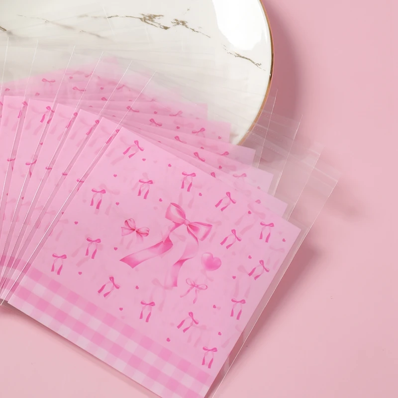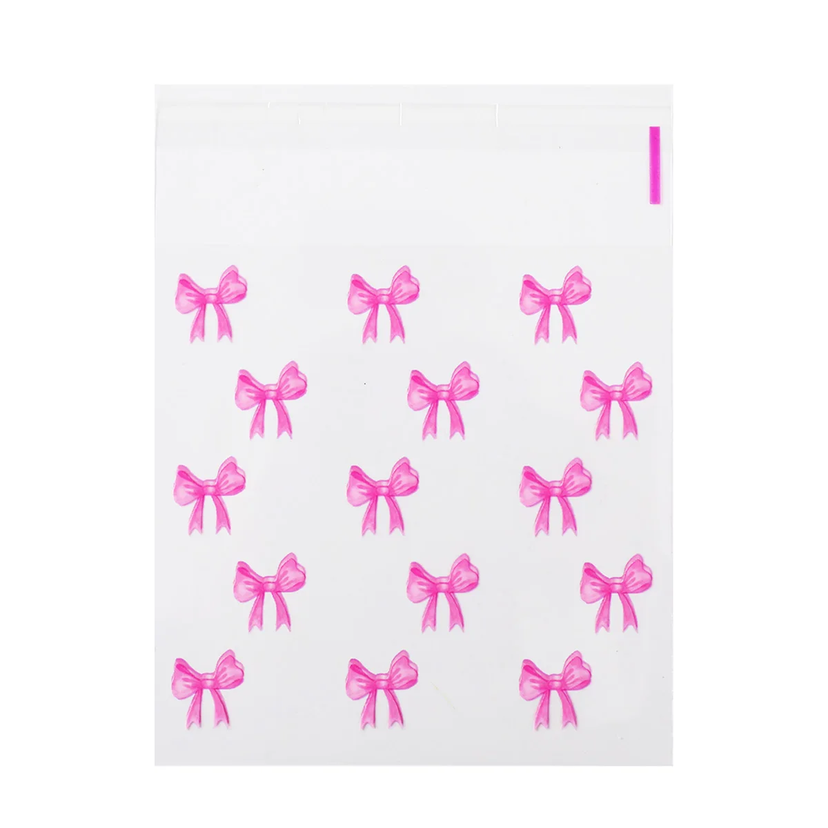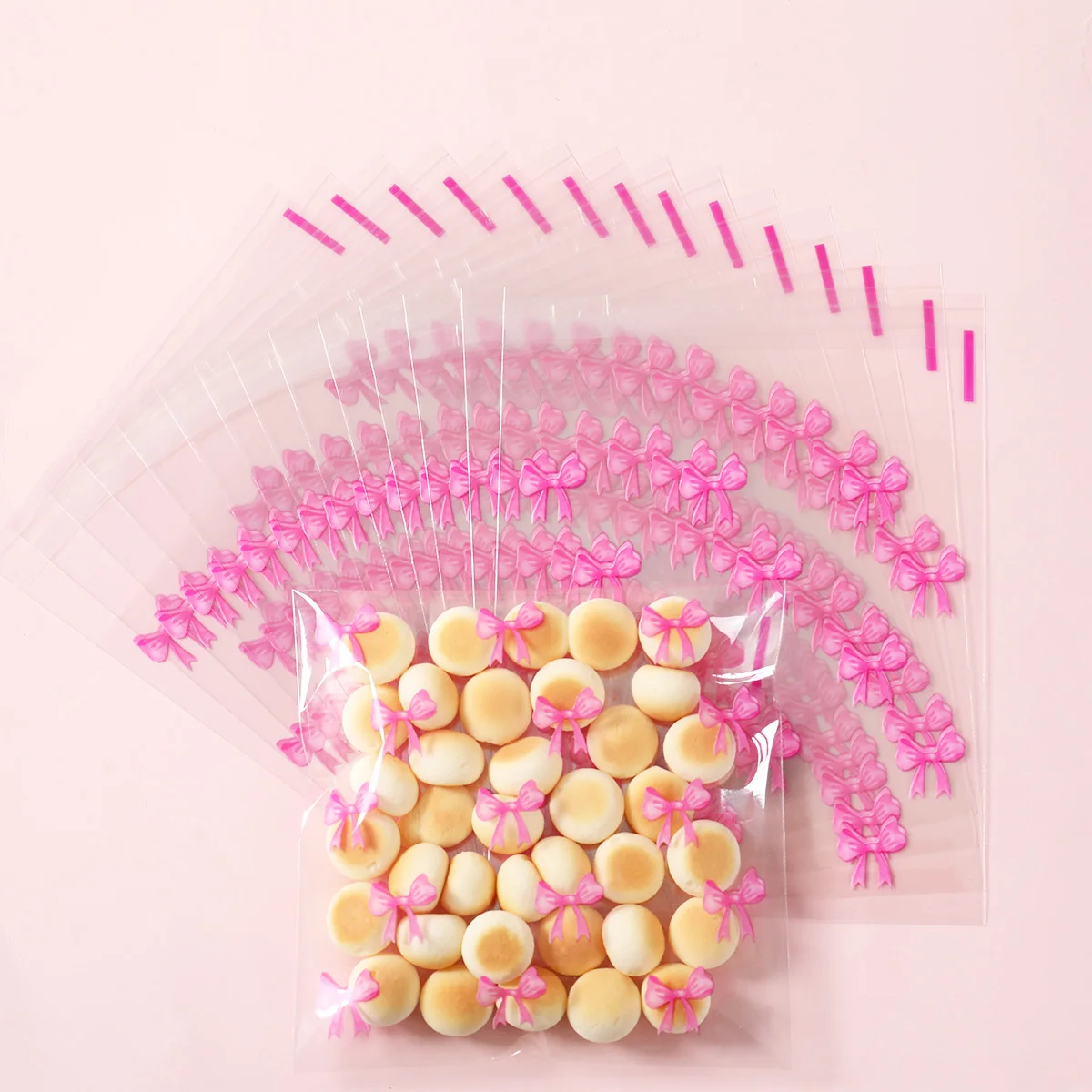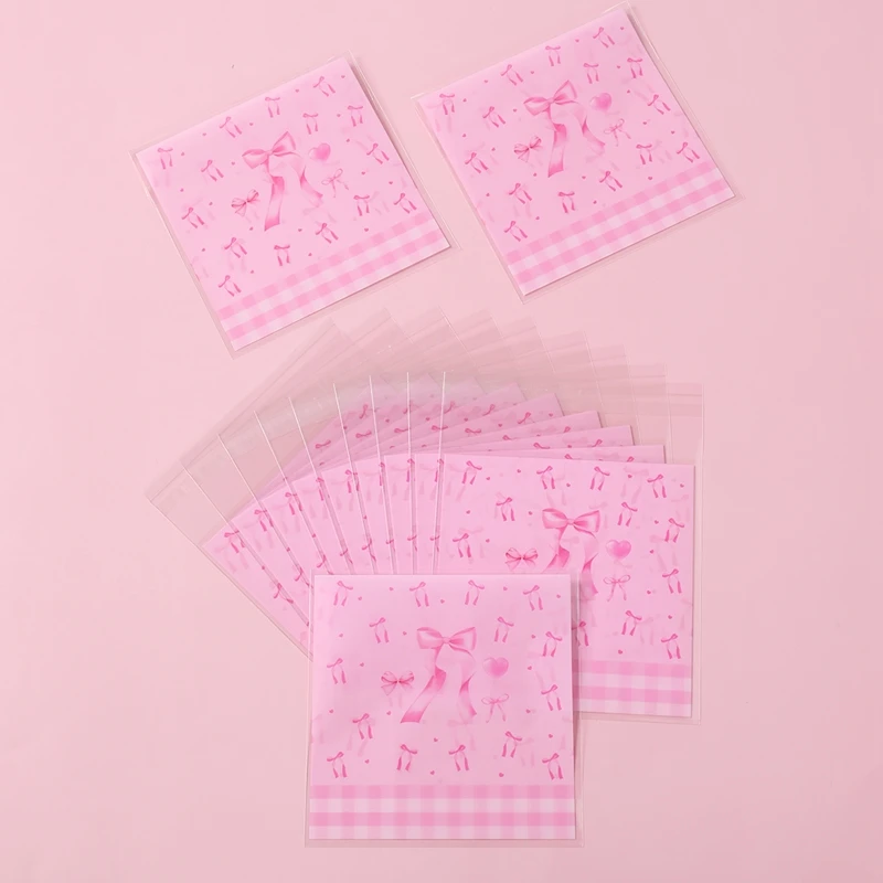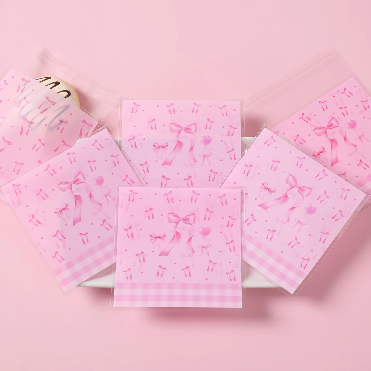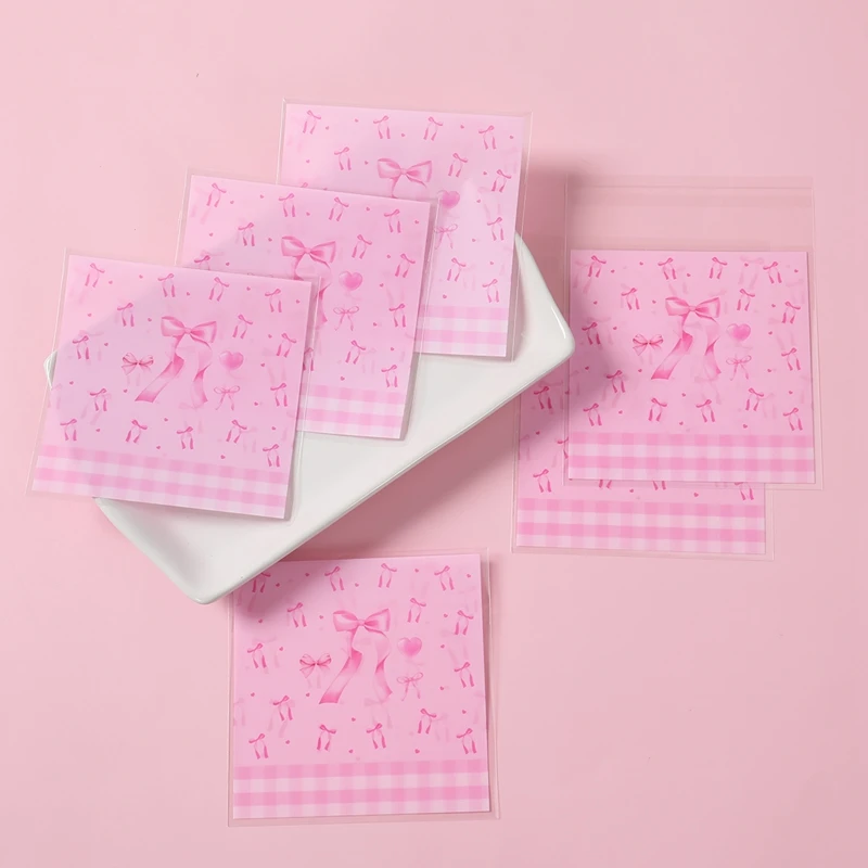 50/100 Uds. Bolsa autosellante Opp de embalaje de regalo cuadrado con lazo rosa, bolsa autosellada Opp con estampado de lazo encantador, bolsas de embalaje de dulces de regalo