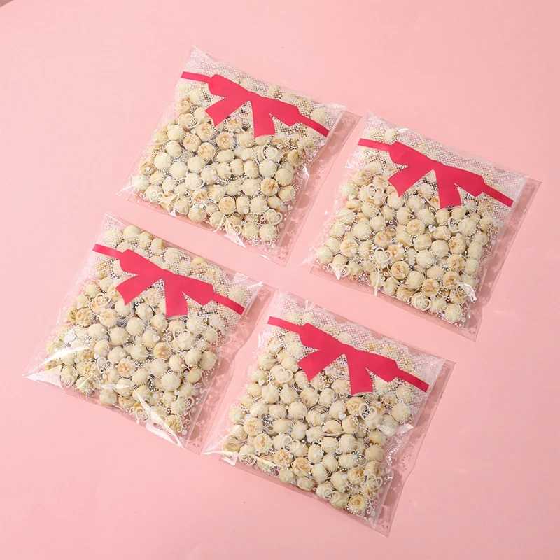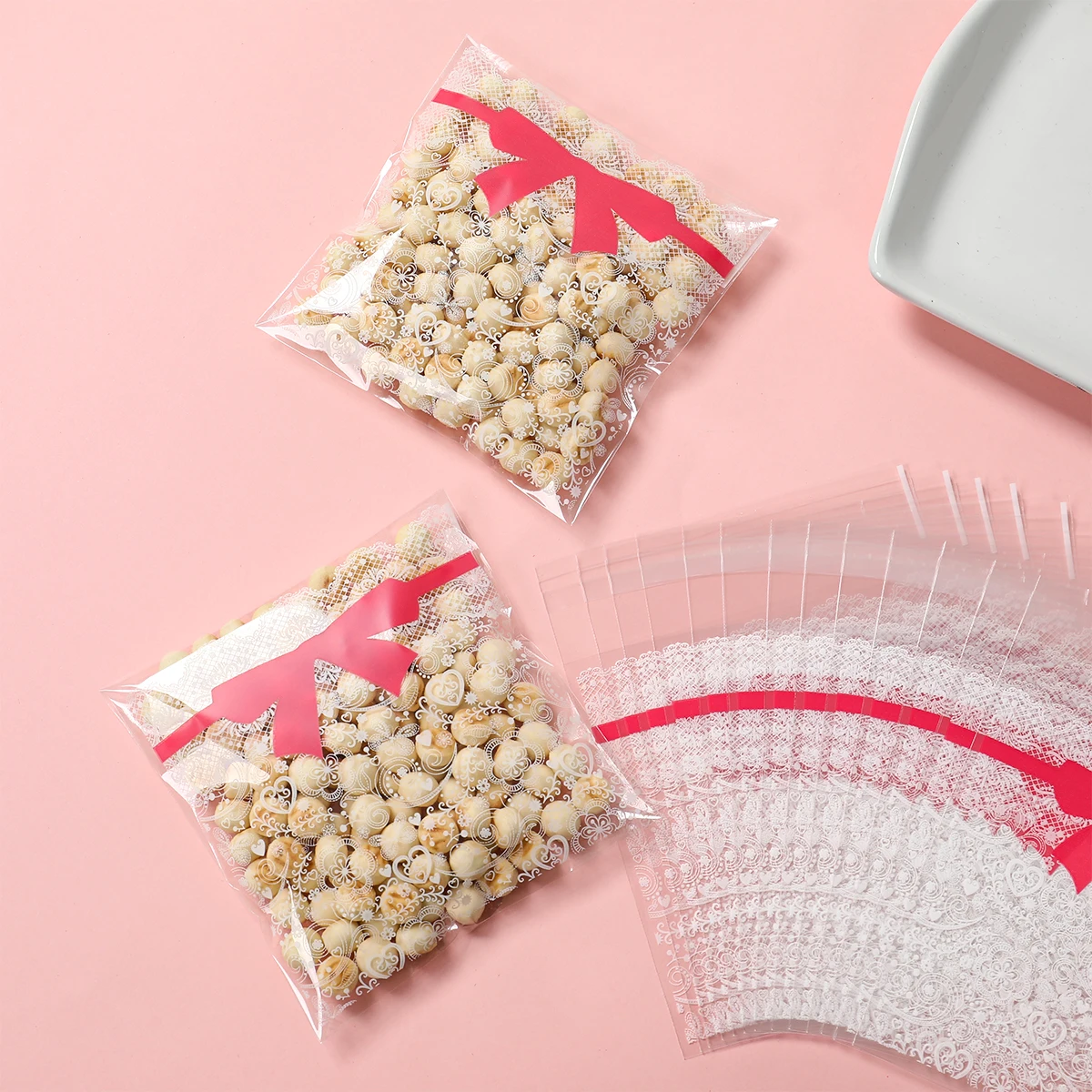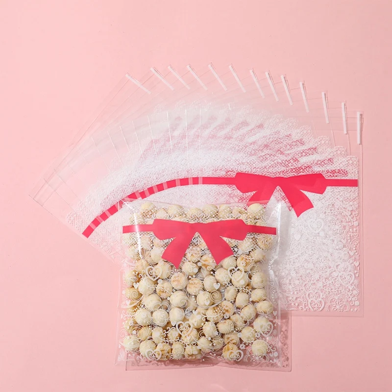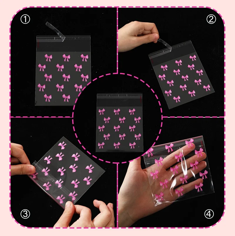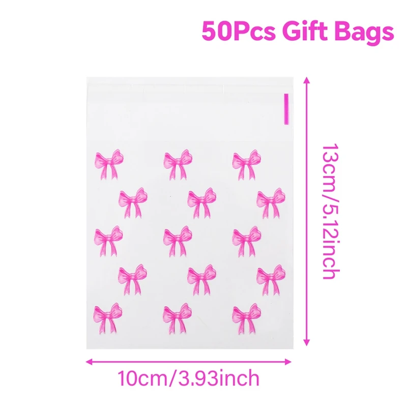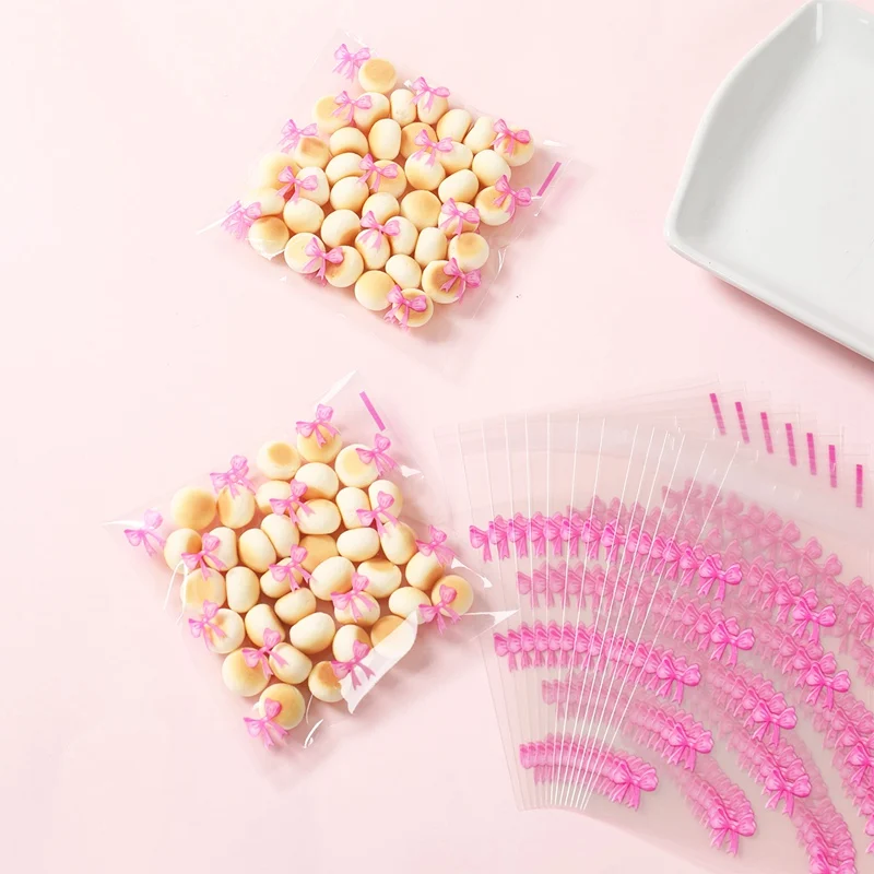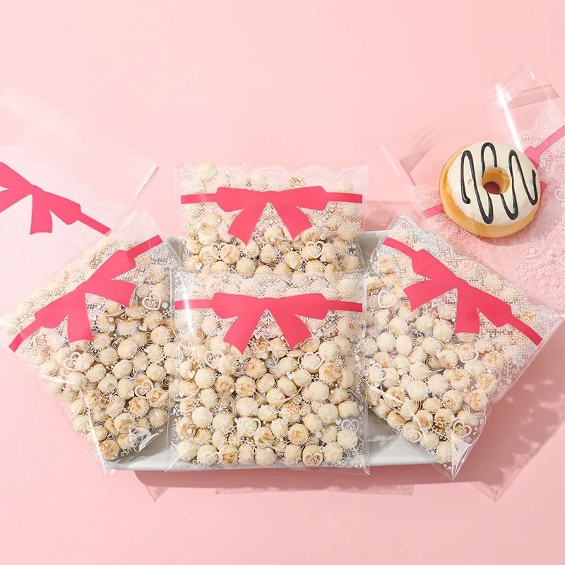 50/100 Uds. Bolsa autosellante Opp de embalaje de regalo cuadrado con lazo rosa, bolsa autosellada Opp con estampado de lazo encantador, bolsas de embalaje de dulces de regalo