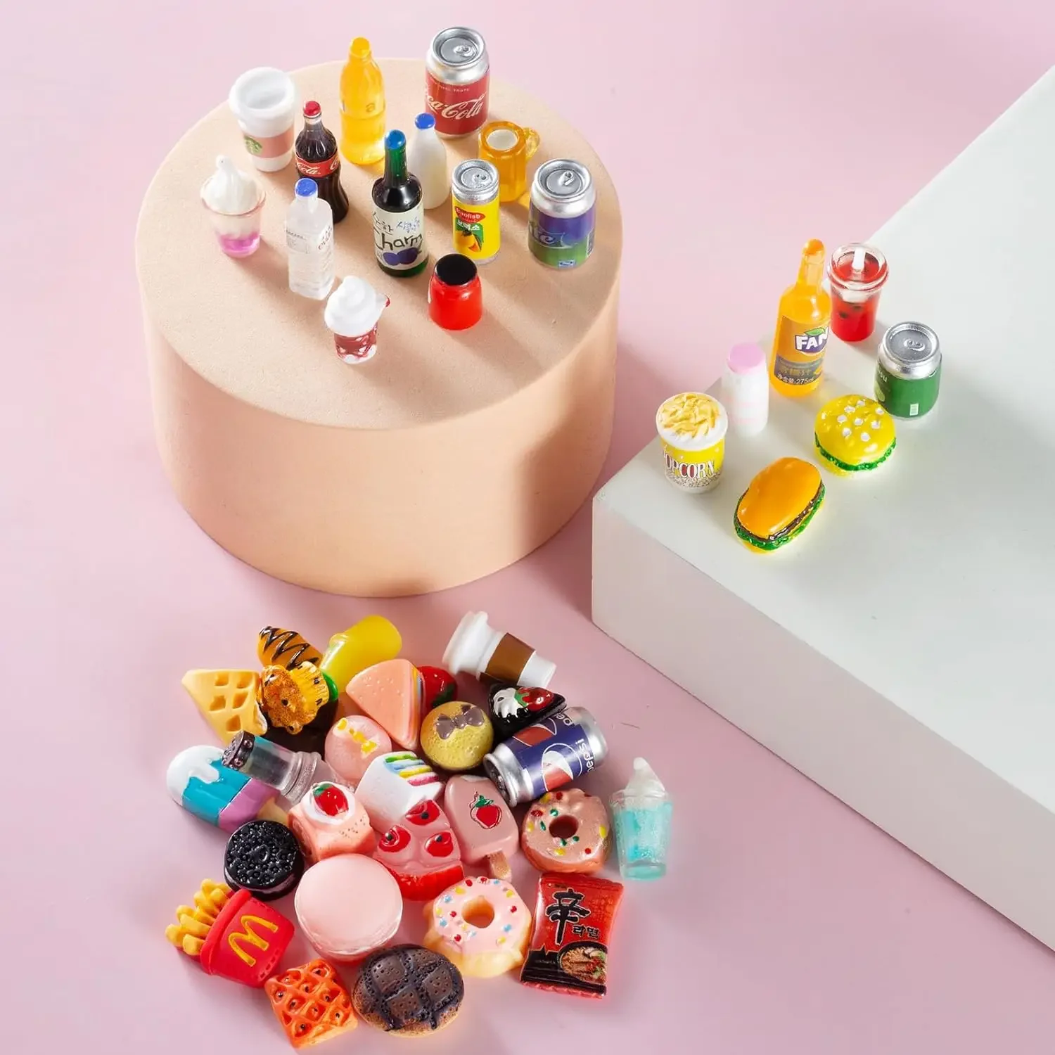 Lindo juego de adornos en miniatura, mini botellas de bebida y paquete de comida, que incluye: hamburguesa, papas fritas, coca, té con leche, helado, pastel, jugo, donas, galletas, etc.perfecto para decoración del hogar, planta suculenta