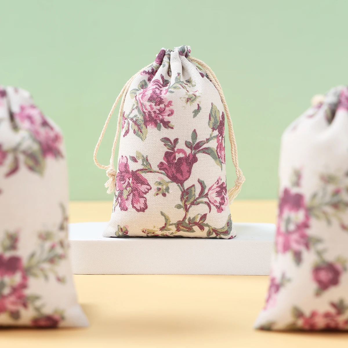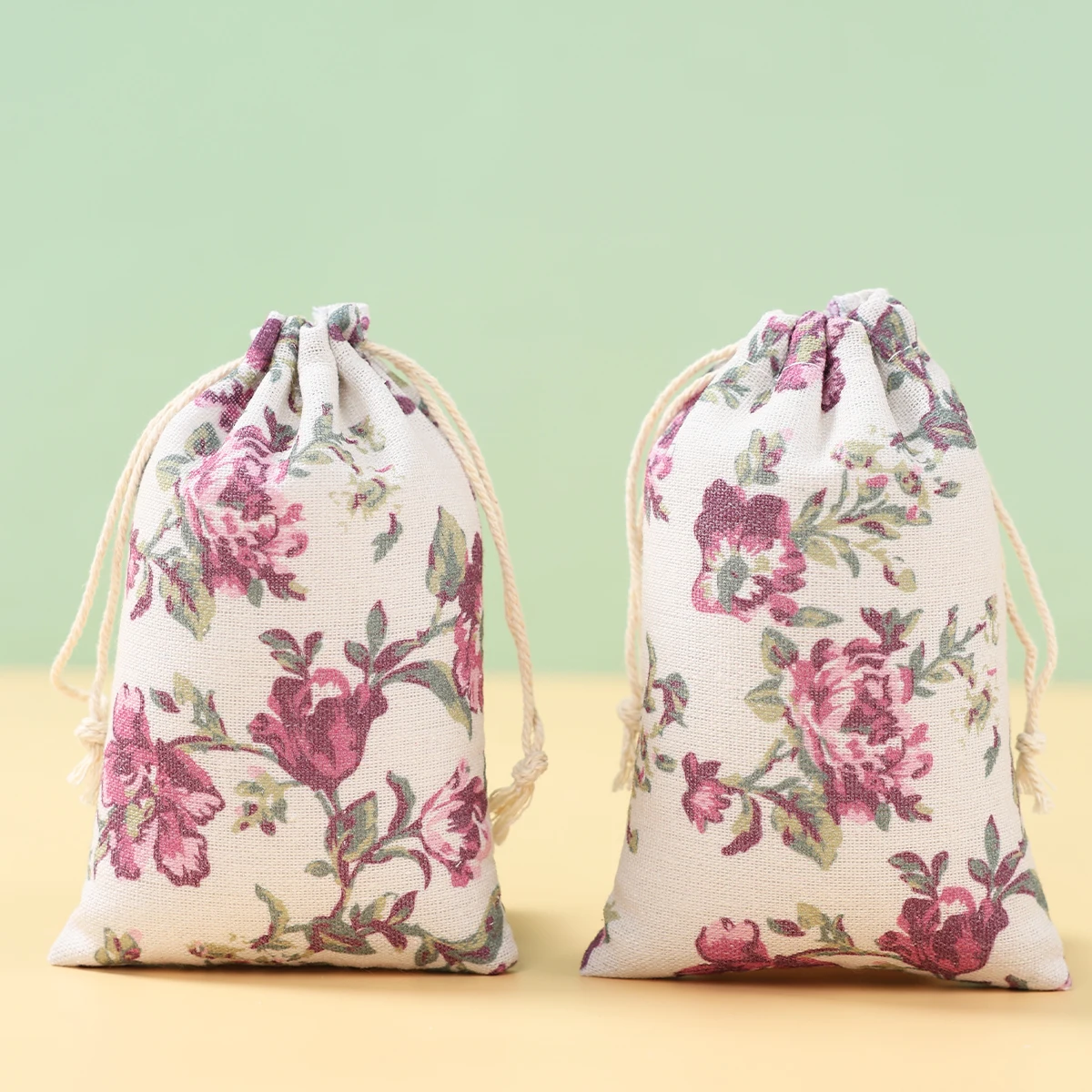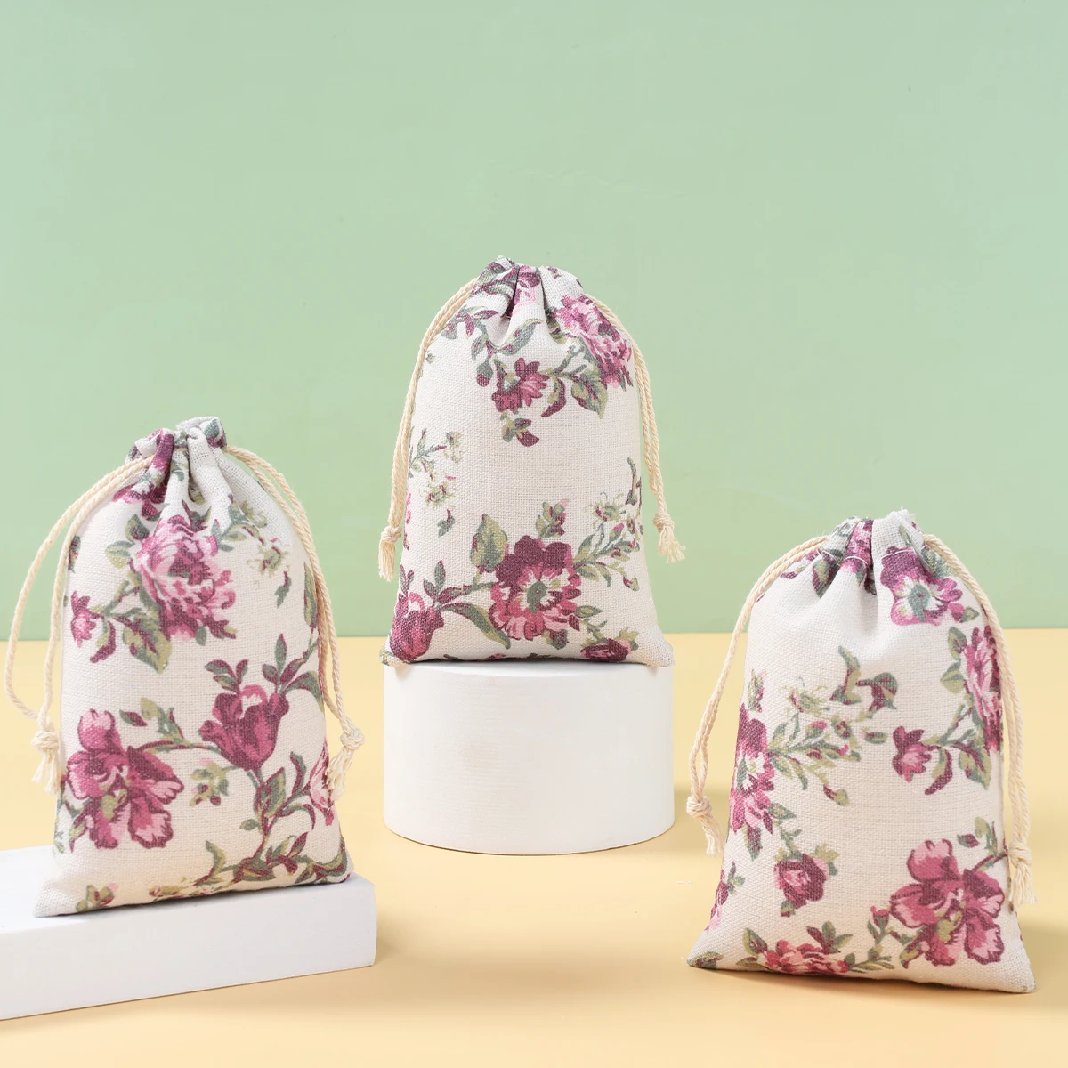 6 uds. Bolsas de regalo de yute de lino con flores moradas, bolsas con cordón, saco de algodón, bolsas de regalo para boda, fiesta de cumpleaños, regalos de navidad