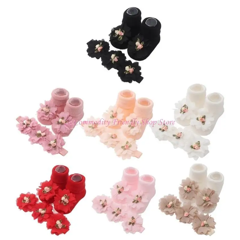 Eleva a tu bebé con este conjunto de calcetines de flores de encaje y una diadema para el pelo.