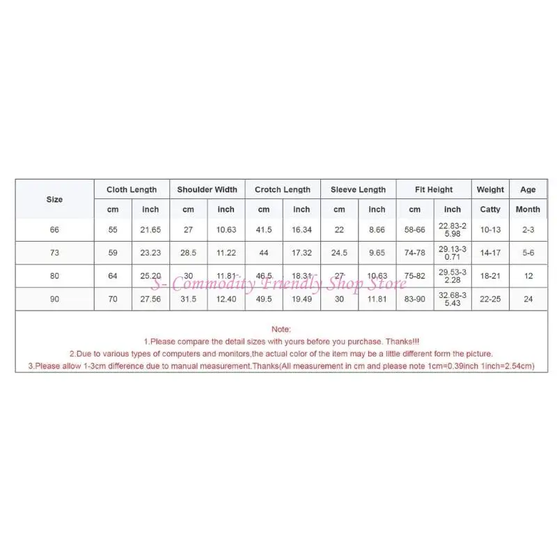 Tamaño: 80 Longitud de la tela: 64 cm (25,20 pulgadas) Ancho del hombro: 30 cm (11,81 pulgadas) Longitud de la entrepierna: 46,5 cm (18,31 pulgadas) Longitud de la manga: 27 cm (10,63 pulgadas) Altura de ajuste: 75-82 cm (29,53-32,28 pulgadas) Peso: 18-21 Catty Edad: 12 meses