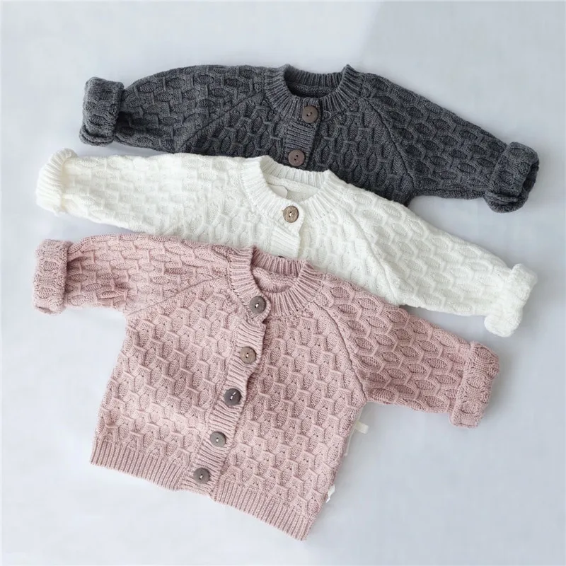 Comprar Abrigo de punto para bebé, suéter cálido para niños y niñas, Tops de otoño e invierno, ropa sólida para recién nacidos, cárdigan de manga larga con cuello redondo, 0-2T