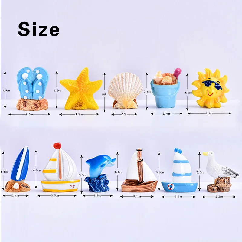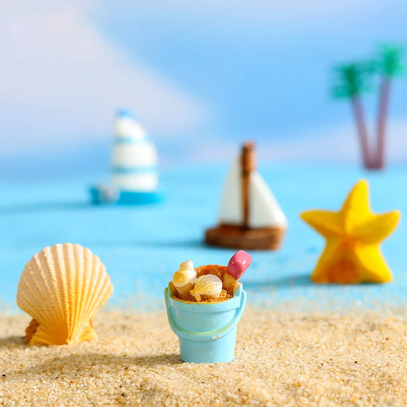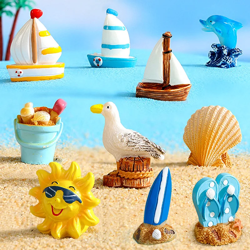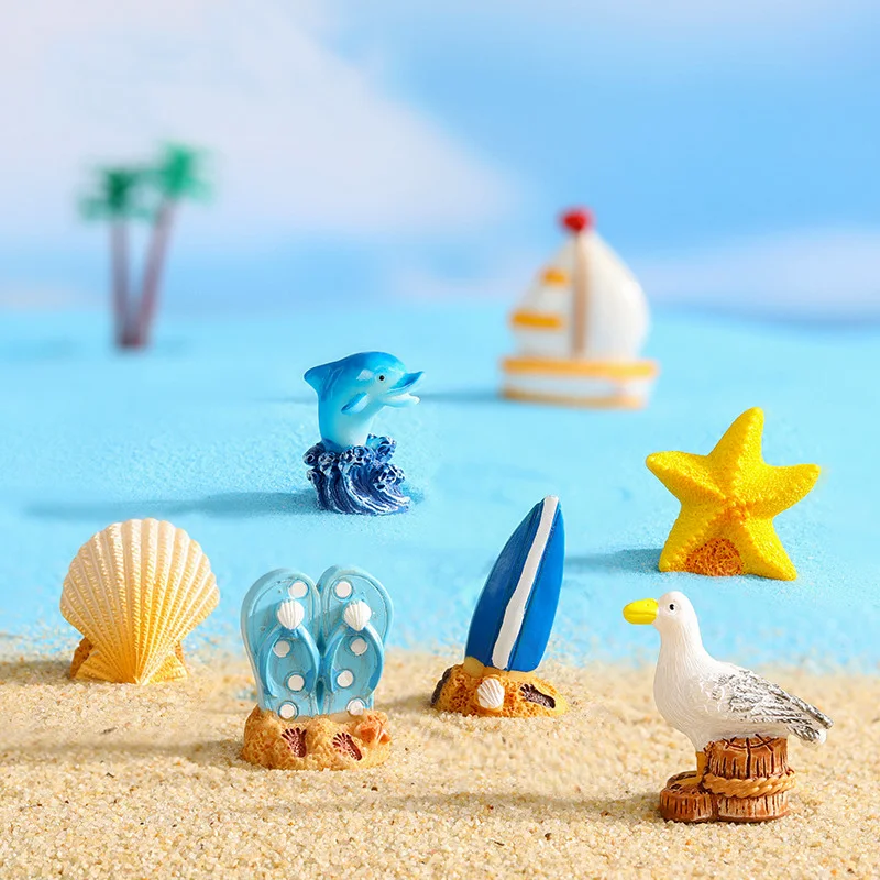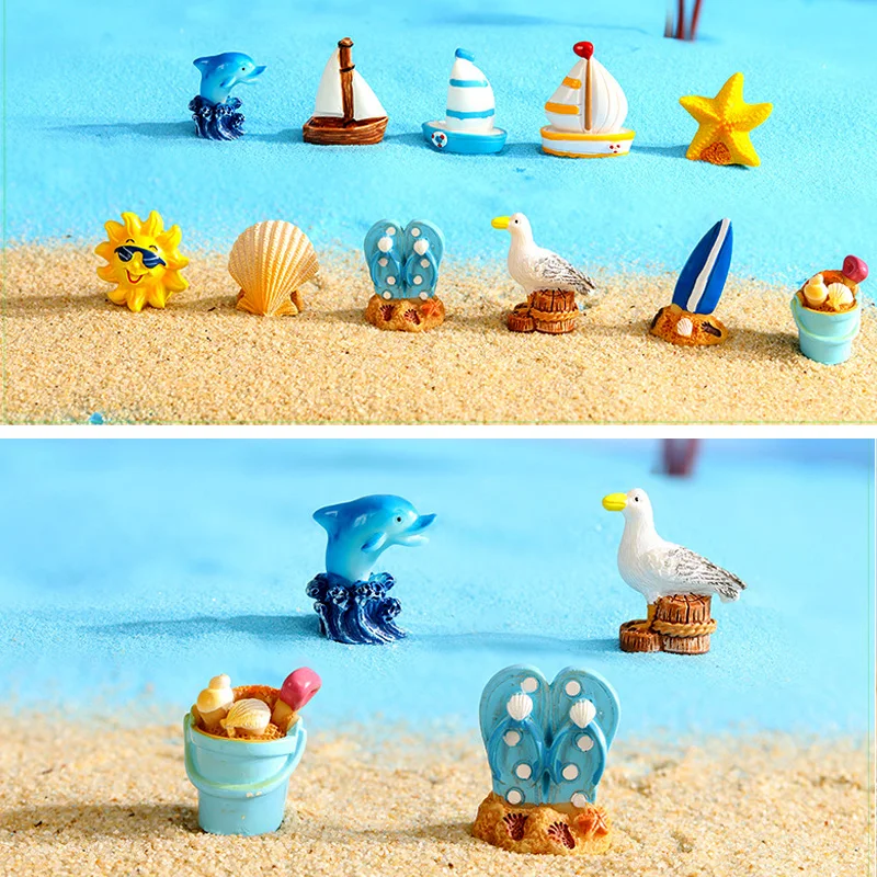 Accesorios de decoración de jardín de hadas en miniatura, estatuilla de verano, sol, Delfín, playa, barco, Paloma, cubo, estrella de mar, zapatos, bricolaje