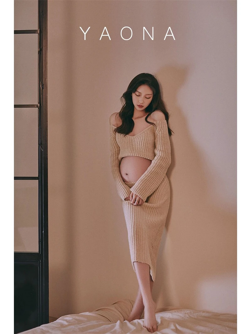 Accesorios de fotografía para mujer, vestidos de maternidad, Tops de punto de embarazo, falda caqui, conjunto de 2 uds., ropa informal para sesión de fotos de estudio coreano