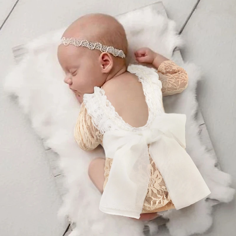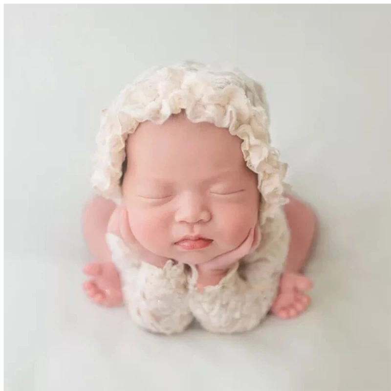 Comprar Accesorios de fotografía para recién nacidos, traje de encaje, pelele, conjunto de gorro, ropa de punto, regalos para fotos de niños, 2 uds.