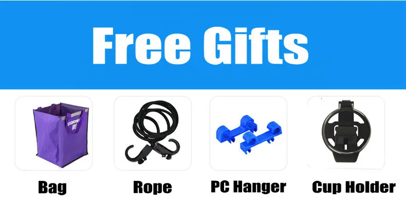 Los obsequios son el gancho, el portavasos, la cuerda y la bolsa de almacenamiento negra grande.