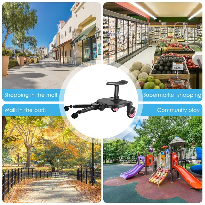 【intimate products】: comfortable cushion,, anti-skid pedal, universal wheel design, so that you can move forward without hindrance,and this product needs the baby carriage rear wheel to have the horizontal axis.
