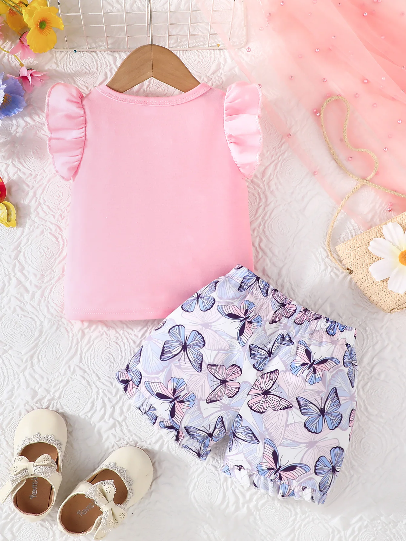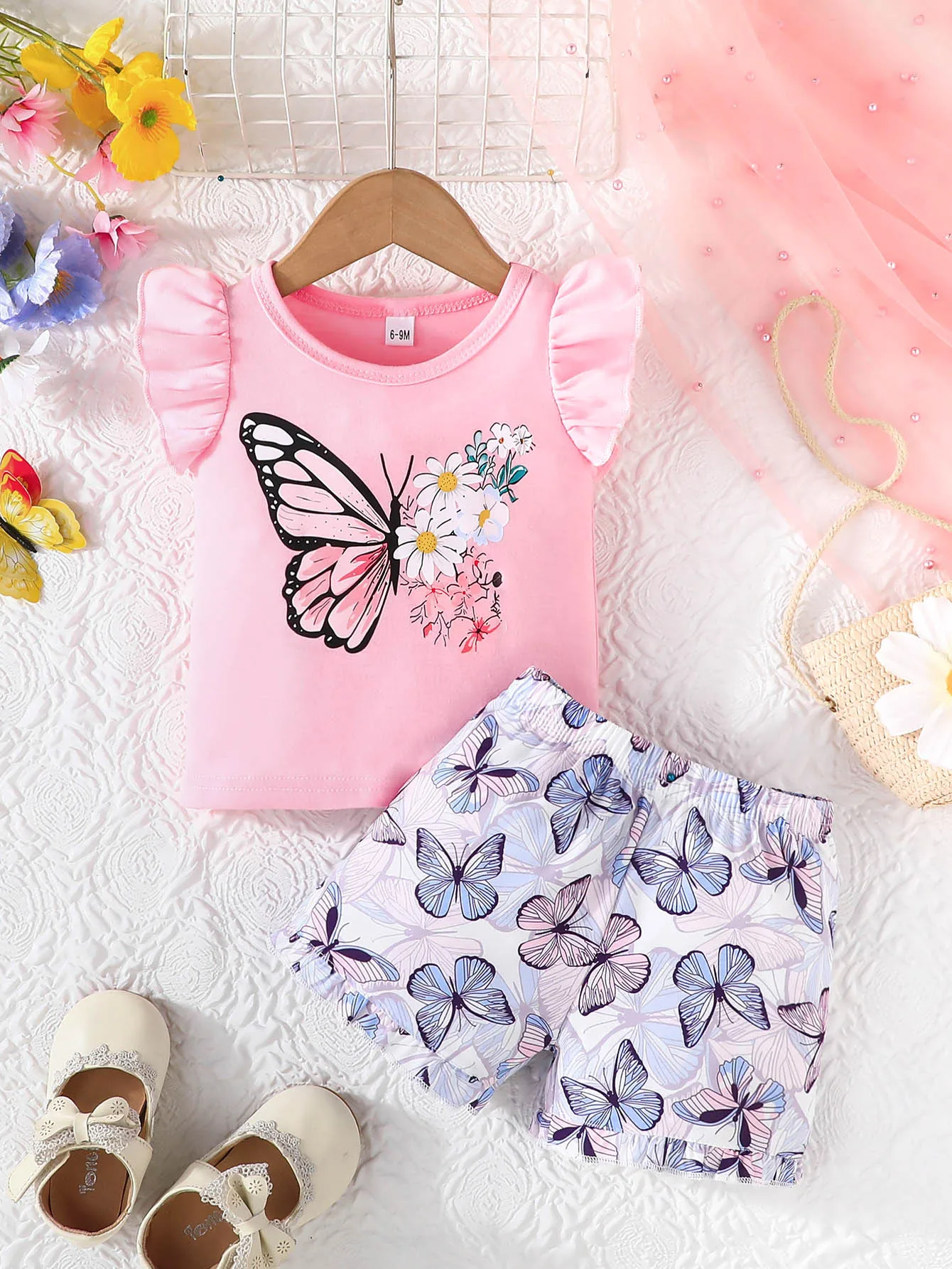 Comprar Adorable conjunto para niños: top sin mangas con estampado de mariposas y flores, pantalones cortos a juego con estampado de mariposas