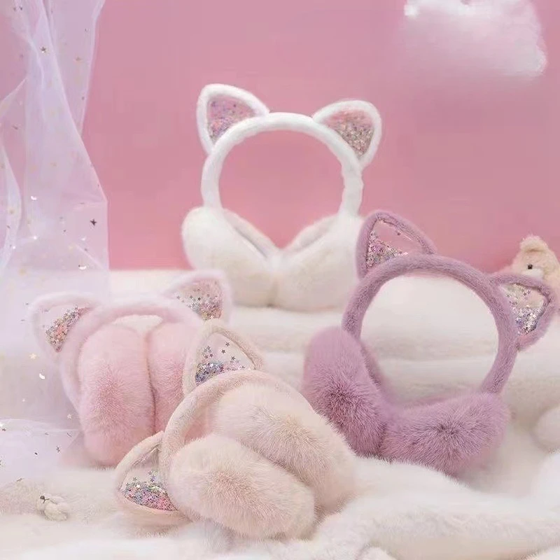 Comprar Adorable diadema con orejas de gato para niños, orejeras plegables de invierno, piel sintética de felpa, forro polar grueso térmico para otoño e invierno