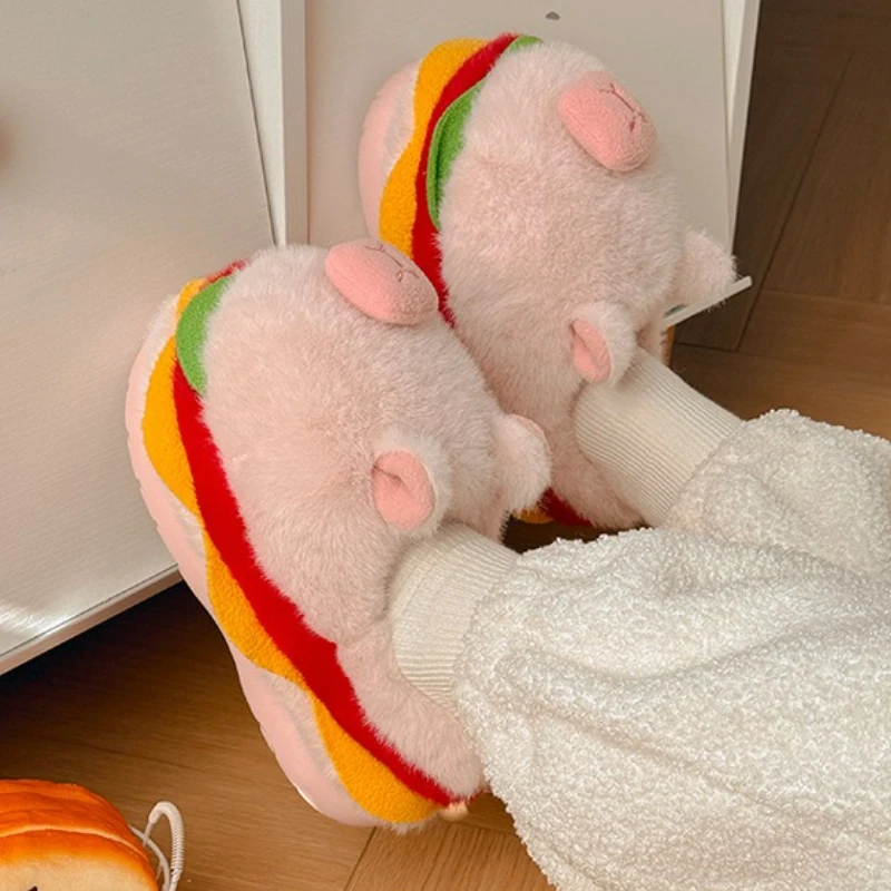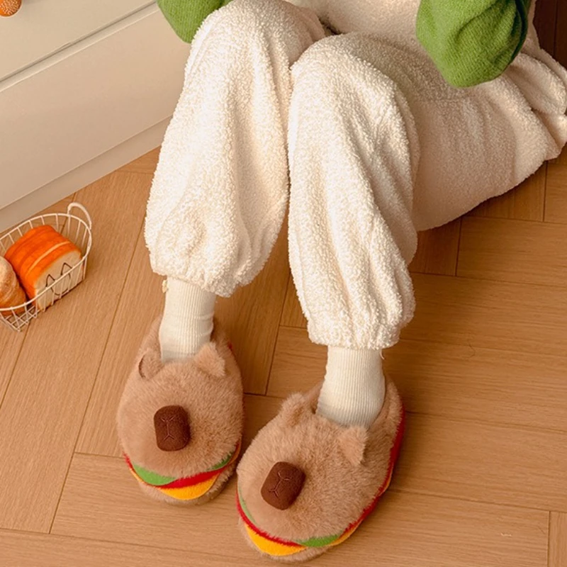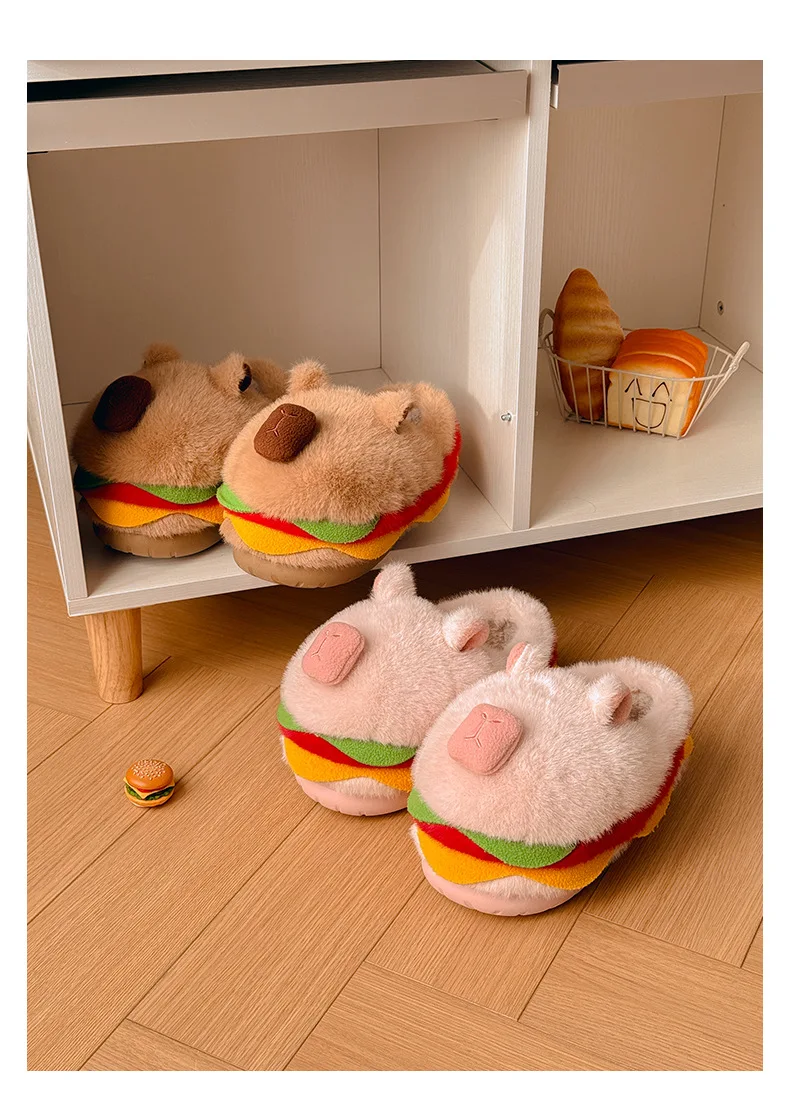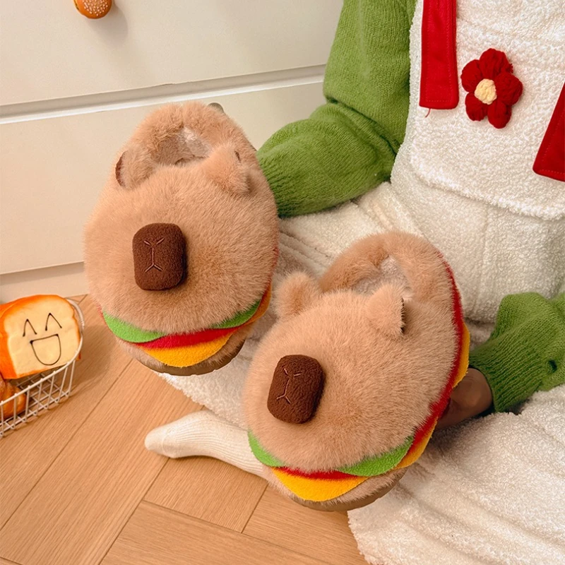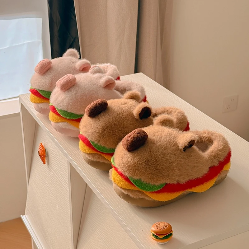 Comprar Adorables zapatillas mullidas de hamburguesa para mujer, zapatos de algodón capibara de piel cálida para interiores, invierno 2025, nuevo
