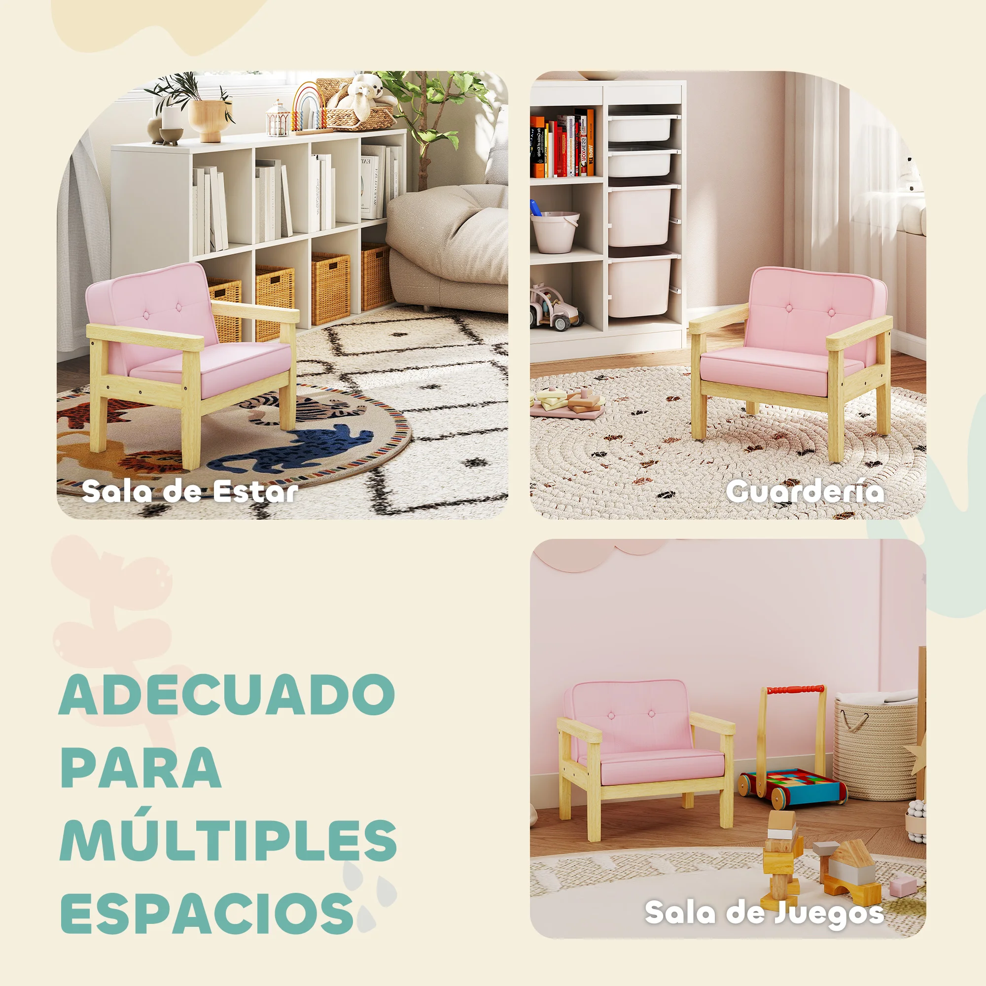 - Tapicería en color rosa que aporta un toque decorativo y tierno a cualquier estancia;