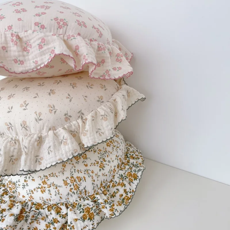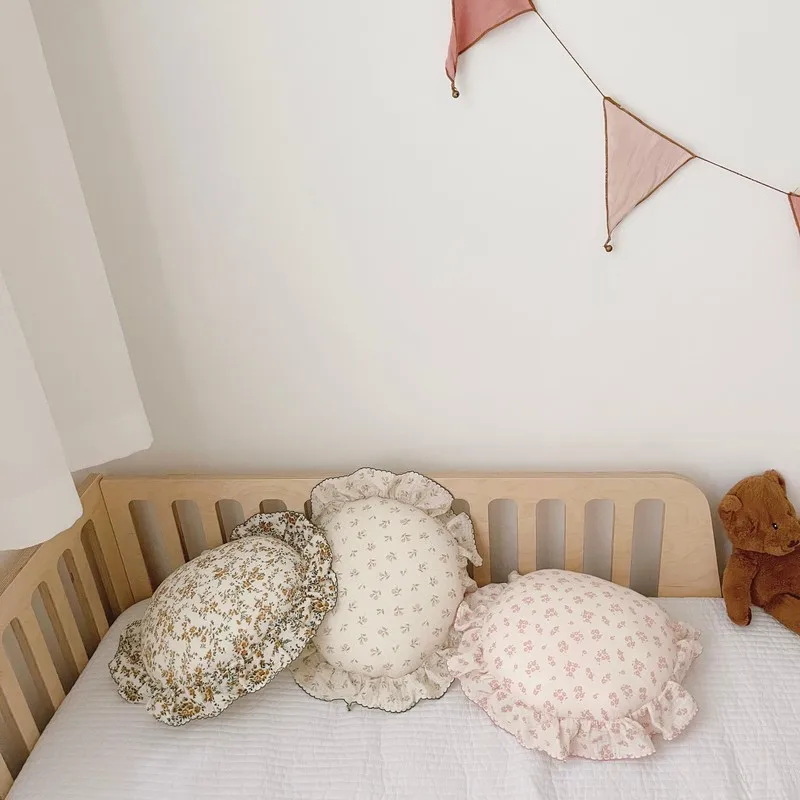 Comprar Almohada redonda de algodón Floral coreano para bebé con volantes, cojín de muselina para niños, ropa de cama para bebé recién nacido, cojines para habitación