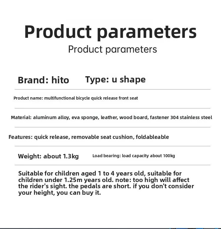 Título EN: Asiento de bicicleta plegable para niños montado en la parte delantera con estructura de aluminio y reposapiés ajustables Características clave: Experiencia de conducción segura para niños pequeños. Fácil instalación con sistema de bloqueo firme. Reposapiés de altura ajustable y ergonómicos. Diseño plegable para un fácil almacenamiento. Hebilla de seguridad ecológica y materiales duraderos. Palabras clave SEO: asiento plegable para bicicleta para niños, asiento de bicicleta montado en la parte delantera, portabebés, asiento de bicicleta para niños de aluminio, silla de bicicleta para niños pequeños, asiento para niños ajustable, asiento de bicicleta para bebés, asiento de seguridad para ciclismo, sillín portátil para bicicleta para bebés, asiento para bicicleta para niños Compra espectáculos