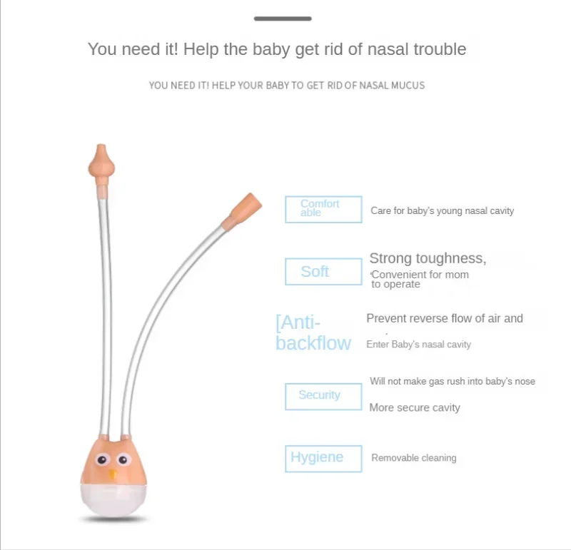 Instrucciones: 1. Introduzca el tubo de succión en la boca, levante al bebé, inserte el tubo de succión en las fosas nasales del bebé y aspire suavemente la secreción nasal. 2. Si el agua nasal se endurece y se condensa, no la fuerce. Primero caliente la nariz con una toalla tibia y luego succione suavemente el agua nasal del bebé.