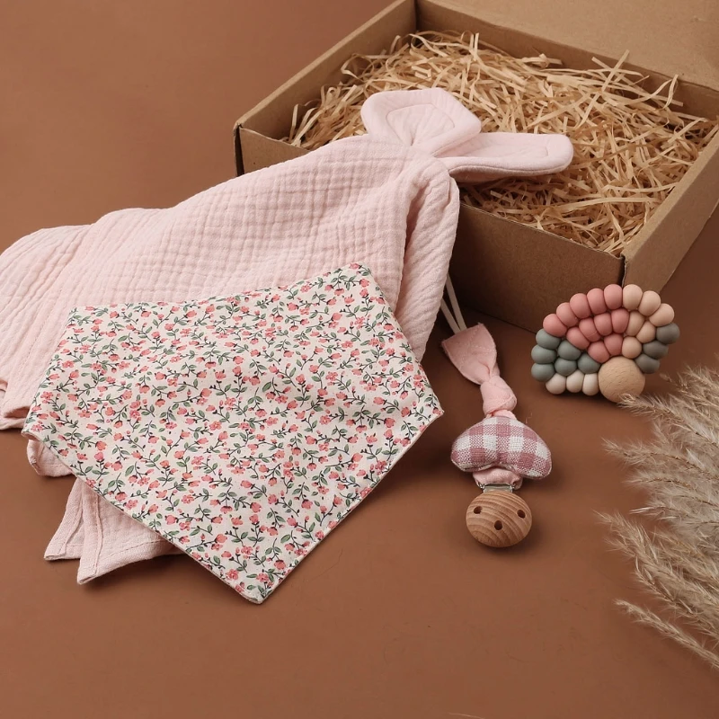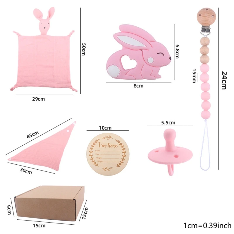 Comprar Babero de lavado de cara cuadrado para bebés, 5 piezas, toalla de apaciguar, cepillo de pelo, sonajero, mordedor, juguete, regalo de Ducha