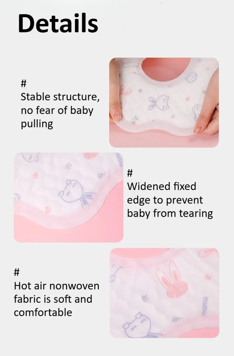 1. Tan suave como una nube, cómodo de usar durante mucho tiempo. Superficie no tejida, suave y cómoda, incluso si la saliva del bebé es demasiada, se puede absorber al instante.