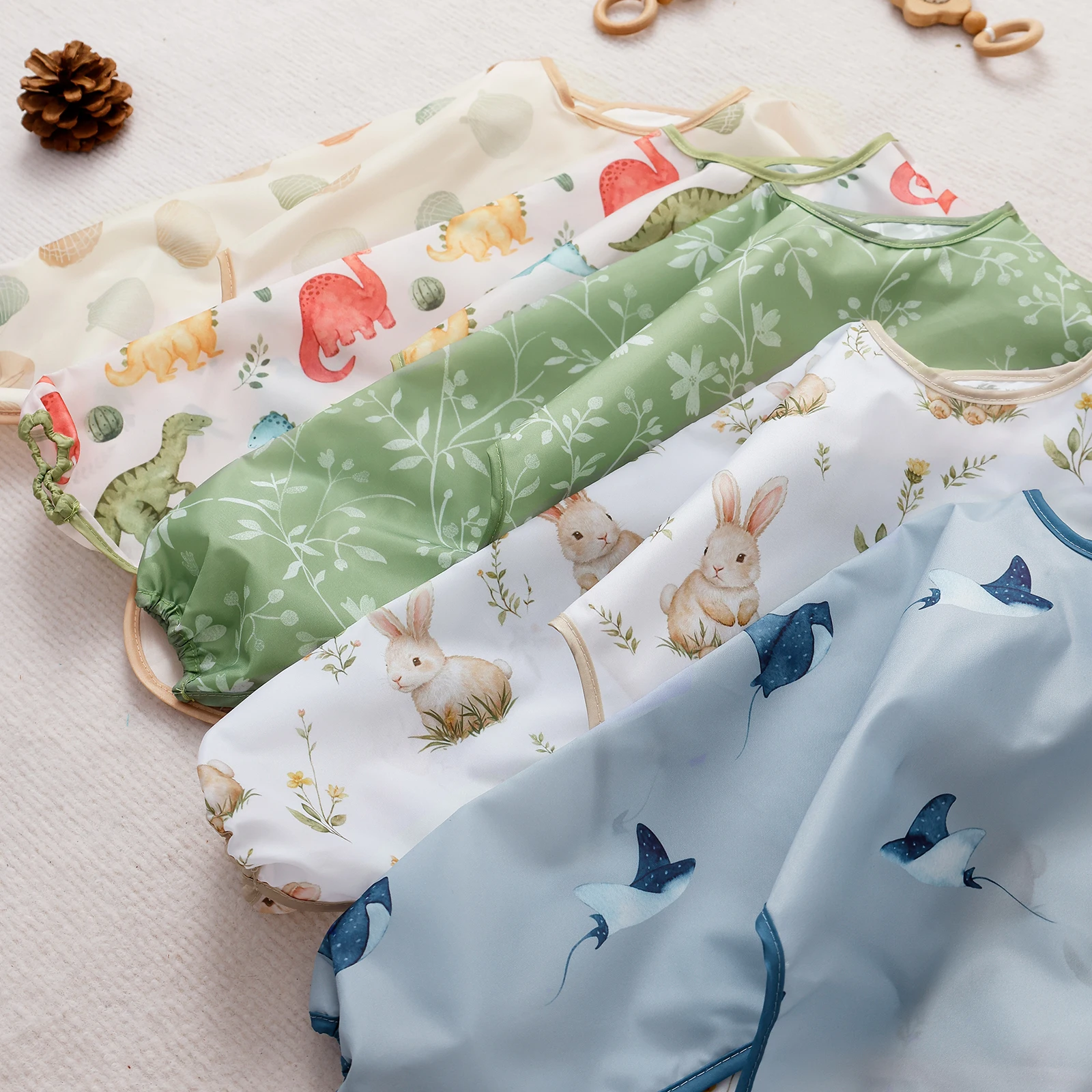 •Los baberos con mangas están hechos de tela laminada de poliuretano, reutilizable, súper impermeable, fácil de limpiar y tela PUL liviana, resistente a las manchas y los olores, saludable para sus bebés.Ligero y fácil de limpiar, lavable a máquina, colgar para secar.